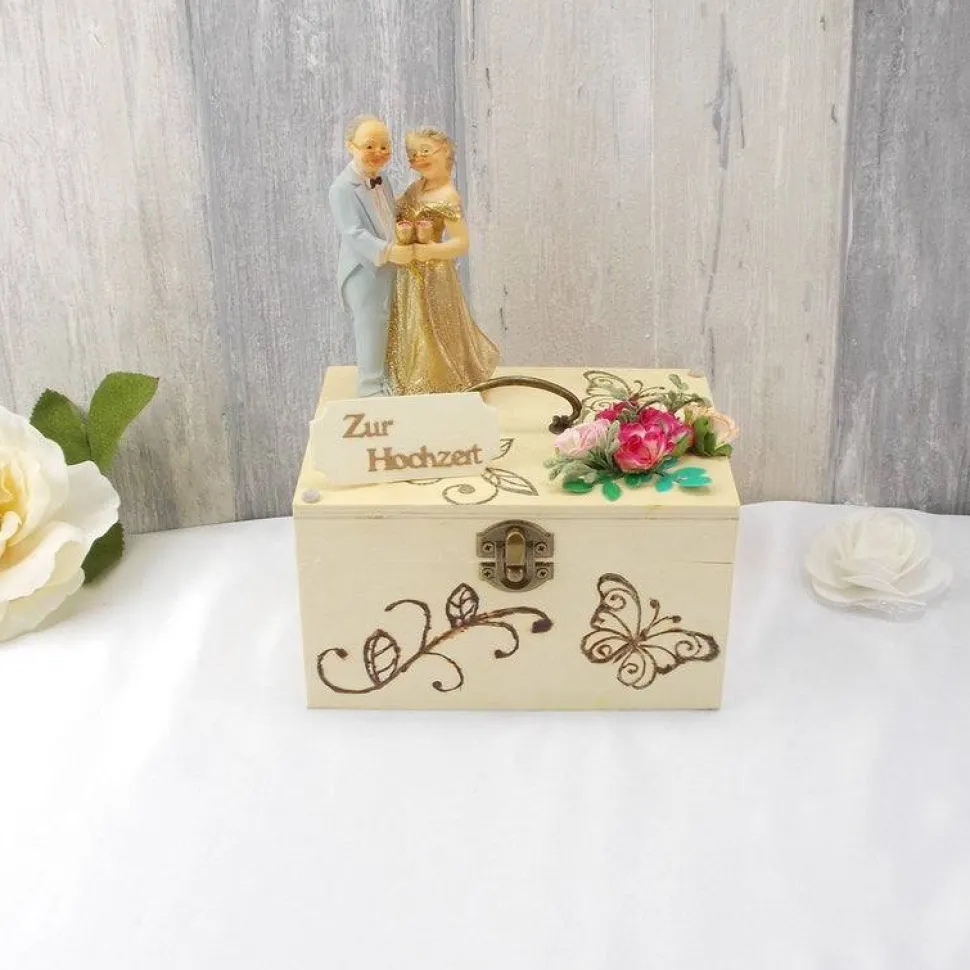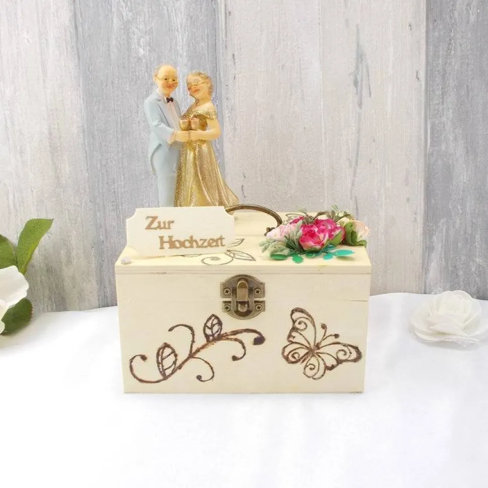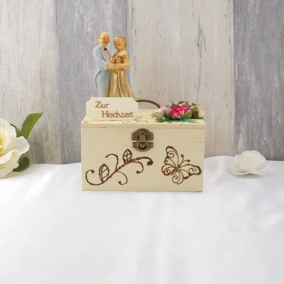 Auf der mit Brandmalerei verzierten Holzbox haben wir ein elegantes Goldpaar, ein paar Blüten und ein kleines Schildchen aufgesetzt.