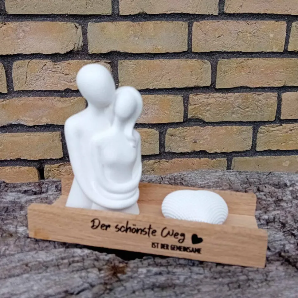 Für mein Dekoobjekt habe ich in liebevoller Handarbeit aus Raysin dieses Liebespaar mit den verschlungenen Armen gegossen. Für die Geschenkverpackung habe ich aus Klötzchenholz einen kleinen Halter gebastelt und mit dem schönen Schriftzug „Der schönste Weg ist der Gemeinsame“ verziert. Ein weißes Herz mit einem schönen Riffelmuster runden das Geschenk ab.