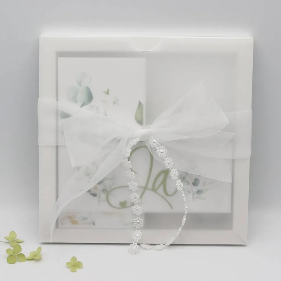 Die transparente Hülle mit dekorativer Schleife verleiht der Hochzeitsverpackung einen eleganten Präsent-Charakter und macht sie sofort bereit zum Verschenken.