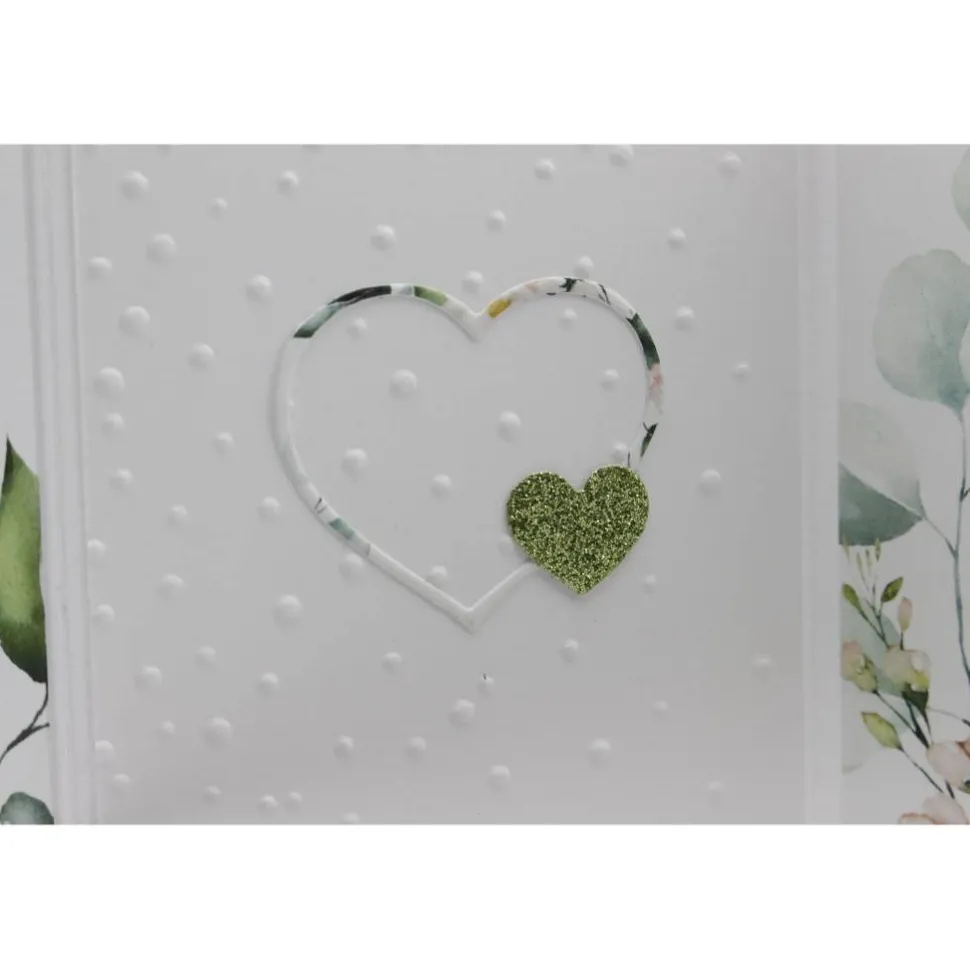 Beim Öffnen entfaltet sich die Box zu einer dekorativen Überraschung: mehrere gestaltete Innenseiten mit der filigranen Silhouette eines Brautpaares, der Schriftzug „Ja“ in edler Glitzeroptik, Herzen sowie der Spruch „zweisam – gemeinsam – für immer“ unterstreichen den romantischen Charakter der Karte. Auf der Rückseite der Karte befindet sich ein Einsteckfach mit der Möglichkeit, Glückwünsche und liebevolle Botschaften aufzuschreiben.