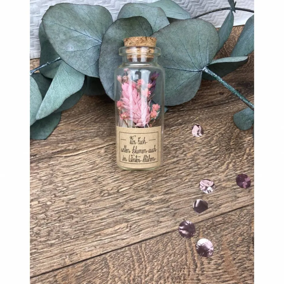 – Fläschchen (7,5 cm x 3 cm) mit Trockenblumen: Für Euch sollen Blumen auch im Winter blühen