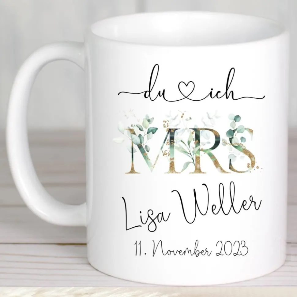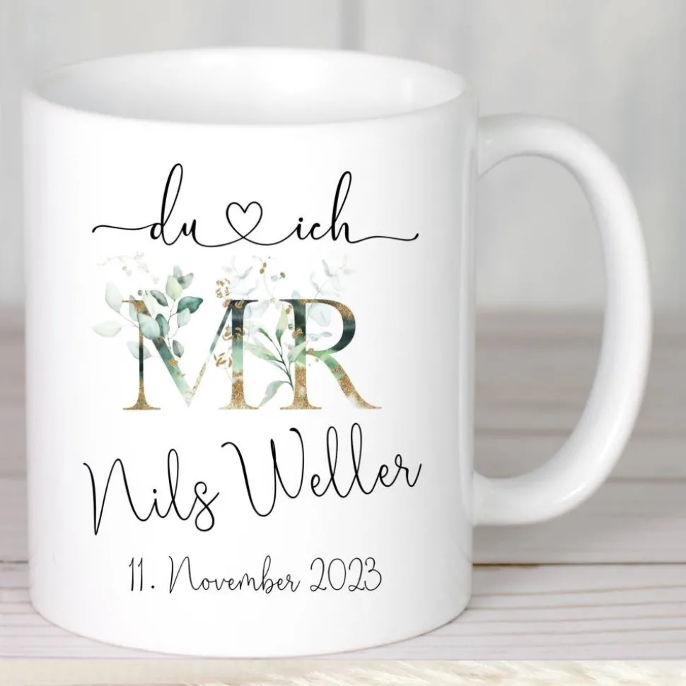 Ihr bekommt zwei Kaffeetassen die mit dem Schriftzug MR & MRS bedruckt werden.