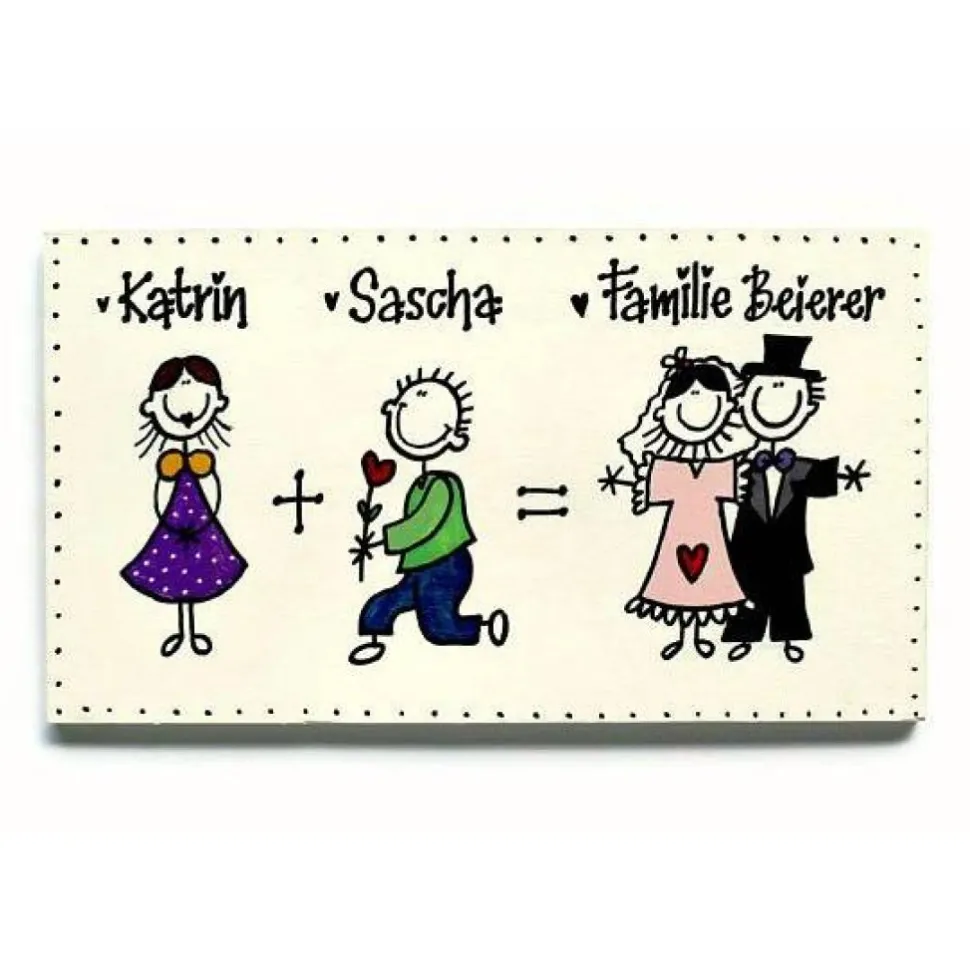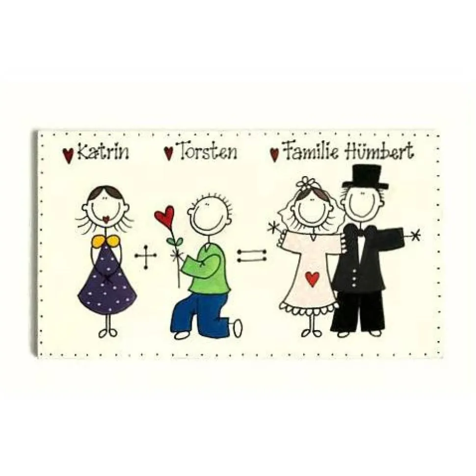 Überrasche das Brautpaar mit einem einzigartigen Hochzeitsgeschenk: Das personalisierte Türschild aus Holz ist voll im Trend und ein toller Blickfang für jeden Eingangsbereich. Links zeigt das Schild das Paar beim Heiratsantrag, rechts als Braut und Bräutigam – ein kreatives Motiv, das den schönsten Tag des Lebens widerspiegelt. Oben werden die Vornamen links und rechts mit „Familie“ und Nachnamen individuell beschriftet. Auch für gleichgeschlechtliche Paare umsetzbar!
