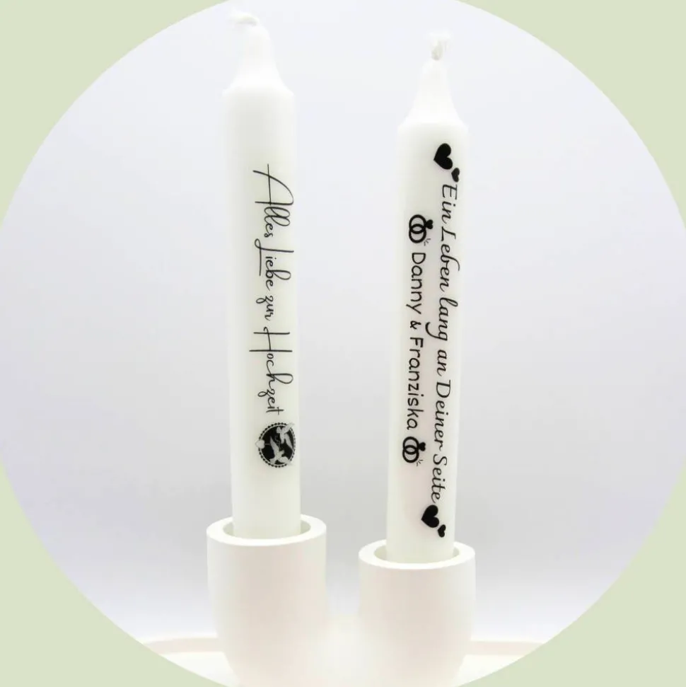 Das Tablett, der Doppel-Kerzenhalter, das Liebespaar sowie die Minivase sind mit einem Gießpulver aus natürlichem Calciumsulfat selbst gegossen, also handgefertigt. Die Kerzen haben eine lange Brenndauer von ca. 6 Stunden und sind mit je einem Kerzentattoo, passend für eine Hochzeit, verziert. Hier erstellen wir sehr gerne nach Deinen Wünschen personalisiert die Kerzentattoos.
