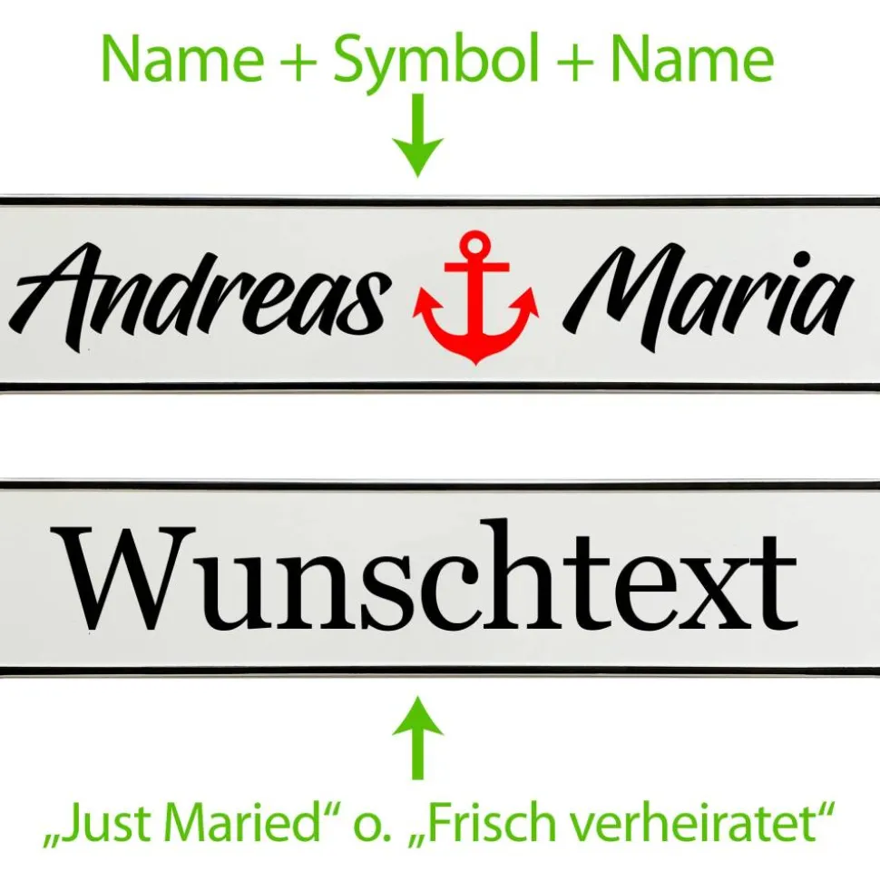 Du gibst einfach die gewünschten Namen an und wählst die passende Schriftart – wir fertigen dein persönliches Hochzeitskennzeichen mit viel Liebe zum Detail. Schon in kurzer Zeit hältst du deine individuelle Autodeko in den Händen.