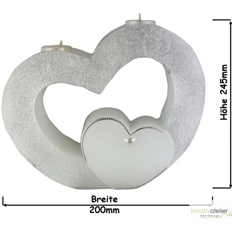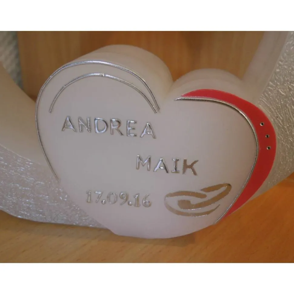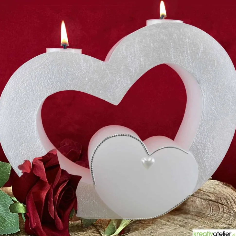 Das Zentrum dieser Doppelhochzeitskerze bildet ein kleines Herz im Inneren eines großen Herzens, umgeben von zwei erneuerbaren Teelichtern. Diese besondere Eigenschaft sorgt dafür, dass die eigentliche Hochzeitskerze lange erhalten bleibt. Die Ränder des kleinen Herzens sind mit silbernen Wachsstreifen verziert und die Mitte wird von einer Halbperle in Herzform geschmückt. Im Inneren des Herzens befindet sich Platz für die Namen der Brautleute und das Hochzeitsdatum. Die Beschriftung wird ausschließlich aus Wachs gefertigt und die Personalisierung erfolgt nach Ihren Wünschen.