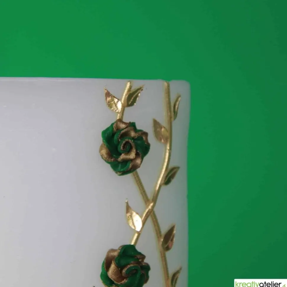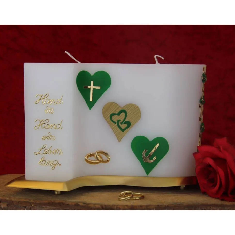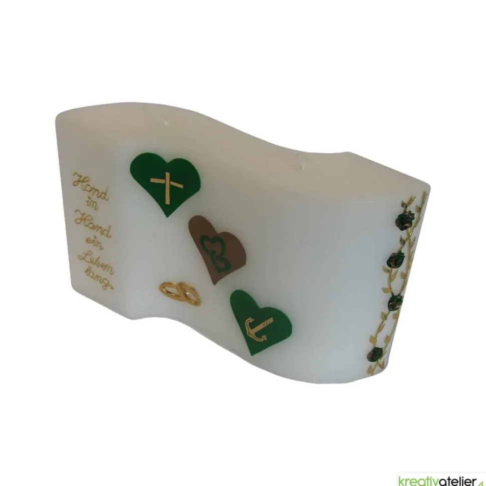 Die drei Herzen mit den Symbolen Anker, Kreuz und Herz stehen für Glaube, Liebe und Hoffnung – die Grundlagen einer glücklichen Ehe. Diese Symbole werden durch das grüne und goldene Wachs besonders hervorgehoben. Der rechte Rand der Kerze ist mit einer Ranke aus handgearbeiteten, zweifarbigen Rosen verziert, die eine romantische Atmosphäre schaffen. Unten links befinden sich zwei liegende Ringe aus goldenem Wachs als Symbol der Verbundenheit des Brautpaares.