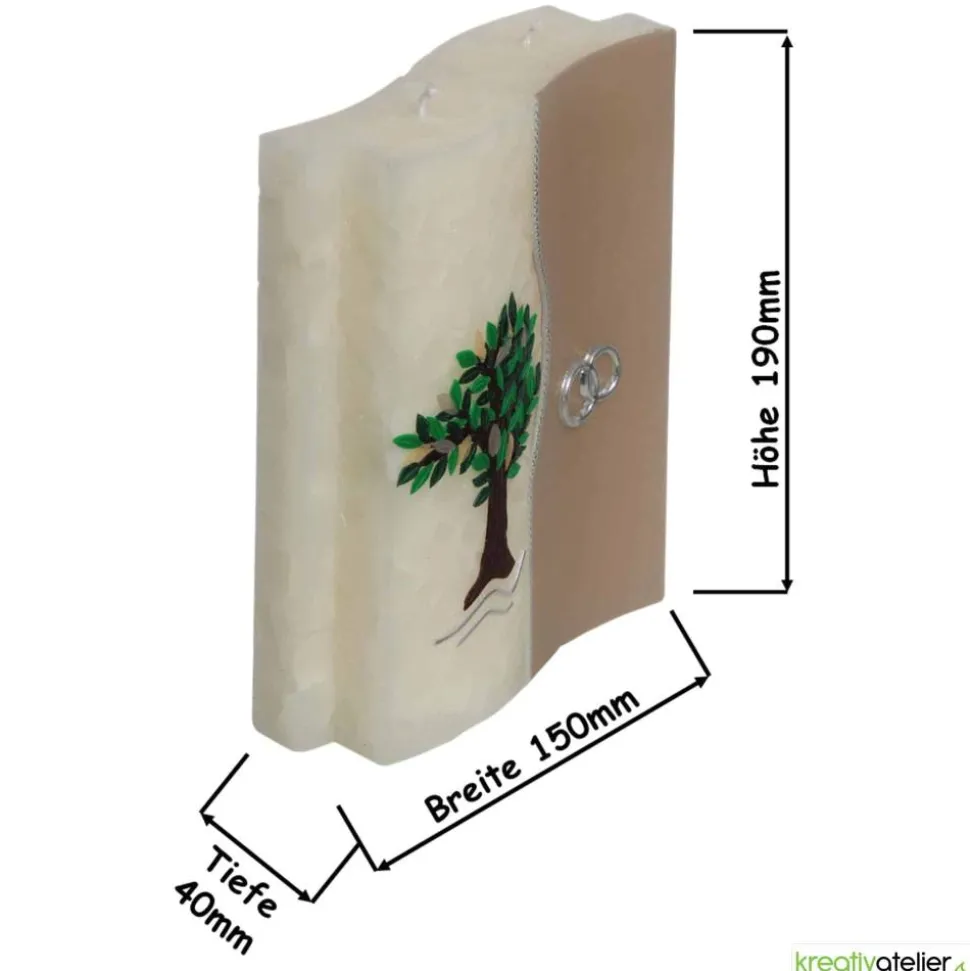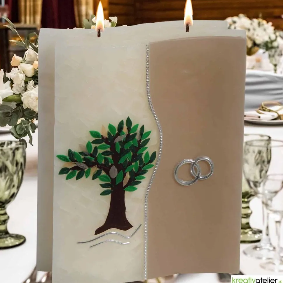 Auf der linken Seite der 2-Dochtkerze befindet sich eine kunstvoll gestaltete Darstellung eines Baumes, dessen Blätter in verschiedenen Grüntönen aus echtem Wachs gefertigt sind. Der Baum steht symbolisch für das Wachstum, die Beständigkeit und die tiefe Verwurzelung in der Liebe. Der Baum ist detailreich gearbeitet, mit einem stabilen Stamm und dichten Blätterkronen, die Lebendigkeit und Naturverbundenheit vermitteln.