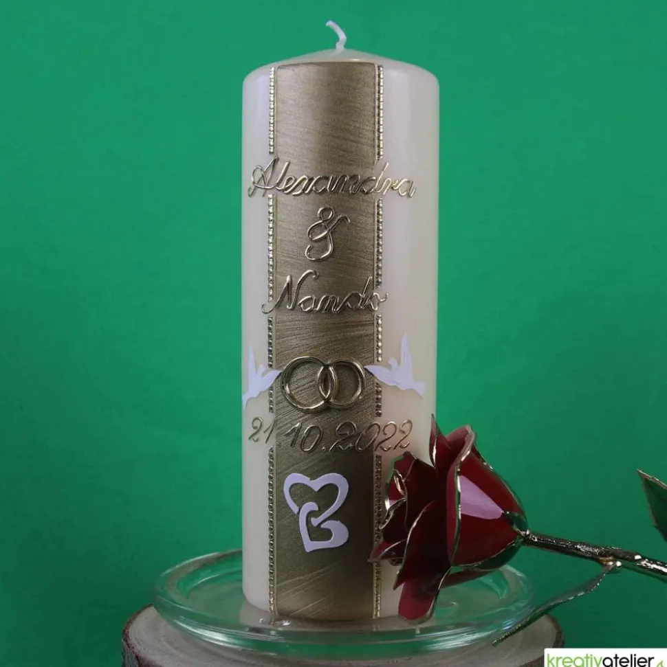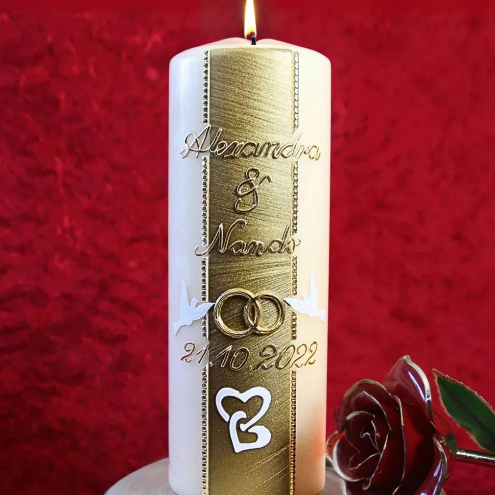Unterhalb der Namen werden die goldenen Eheringe von zwei kleinen, weißen Tauben gehalten. Diese Tauben symbolisieren Frieden und Liebe und verleihen der Kerze eine zusätzliche Bedeutung. Den unteren Teil der Hochzeitskerze zieren zwei ineinander verschlungene Herzchen aus weißem Wachs, die die romantische Gestaltung der Kerze abrunden.