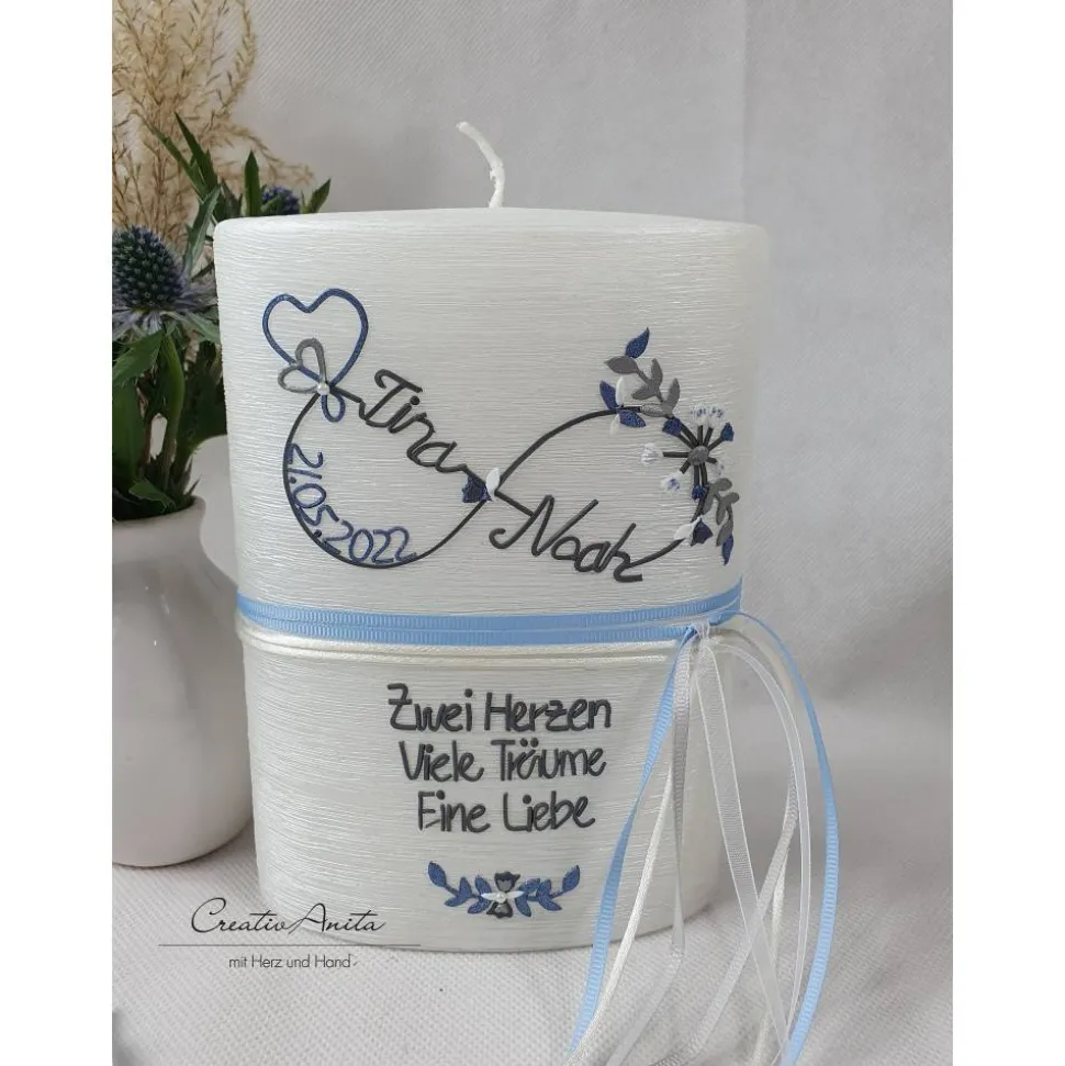 Wunderschöne Hochzeitskerze in Perlmutt weiß, dekoriert mit dem Unendlichkeitszeichen, Herz und Blättern in grau-blau-weiß. Mit Spruch -Zwei Herzen Viele Träume Eine Liebe-. Dekoriert wird die Kerze mit hochwertigen Bändern.