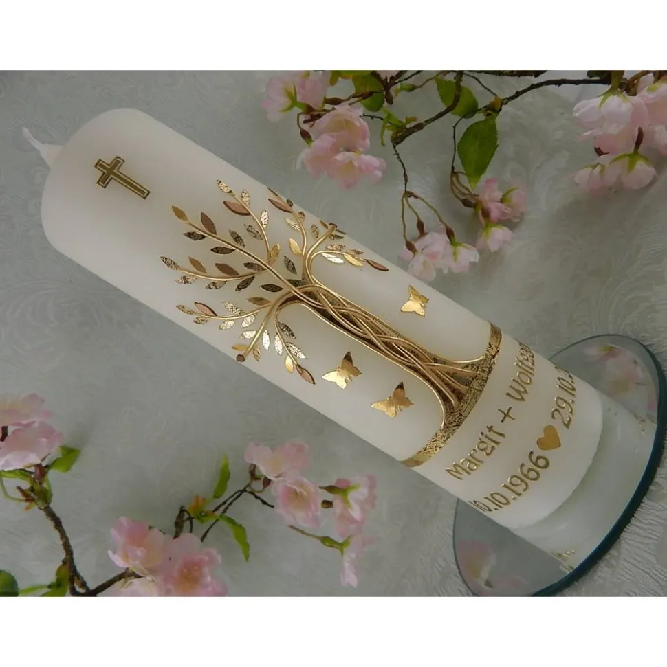 Hochzeitskerze Lebensbaum – goldene Hochzeit – Hochzeitskerze – Hochzeitskerze Baum – Hochzeit Dekoration – Hochzeit Geschenk – gold – mit Name Datum 250/70 mm Original Design HKR185