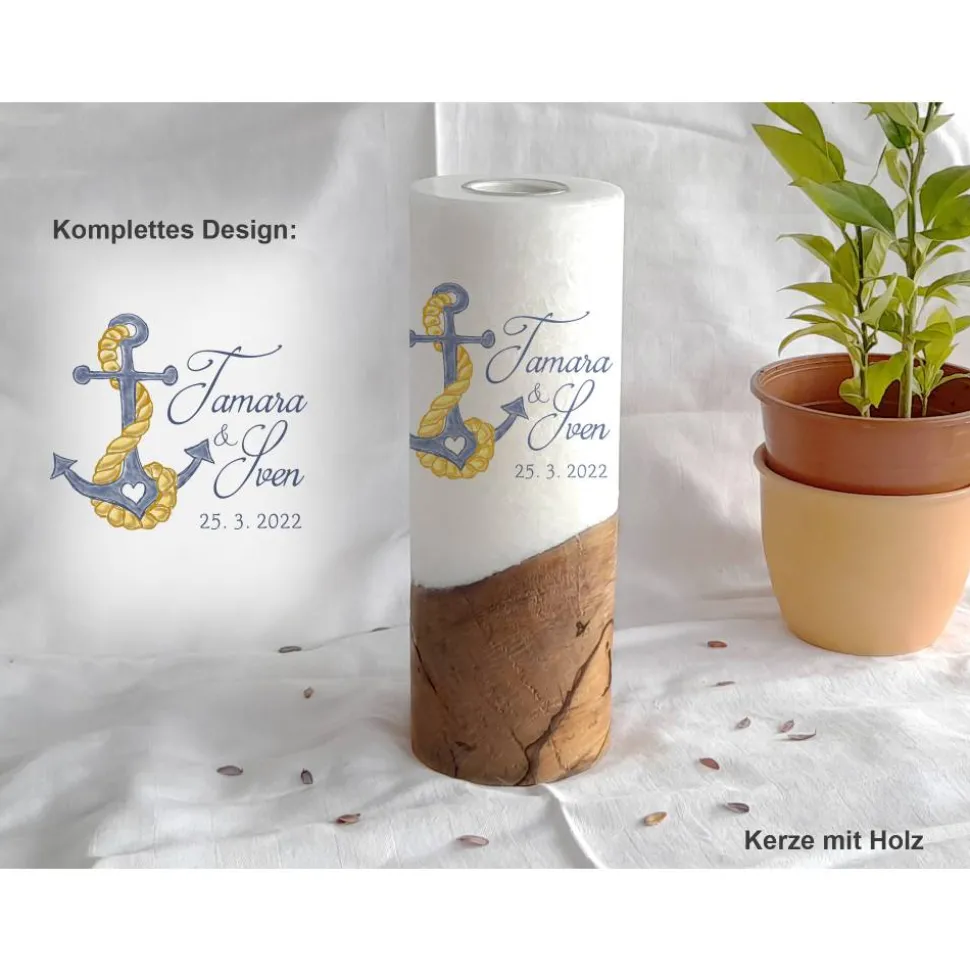 Die Kerze wird ohne Dekoration (Holzscheibe etc.) geliefert.