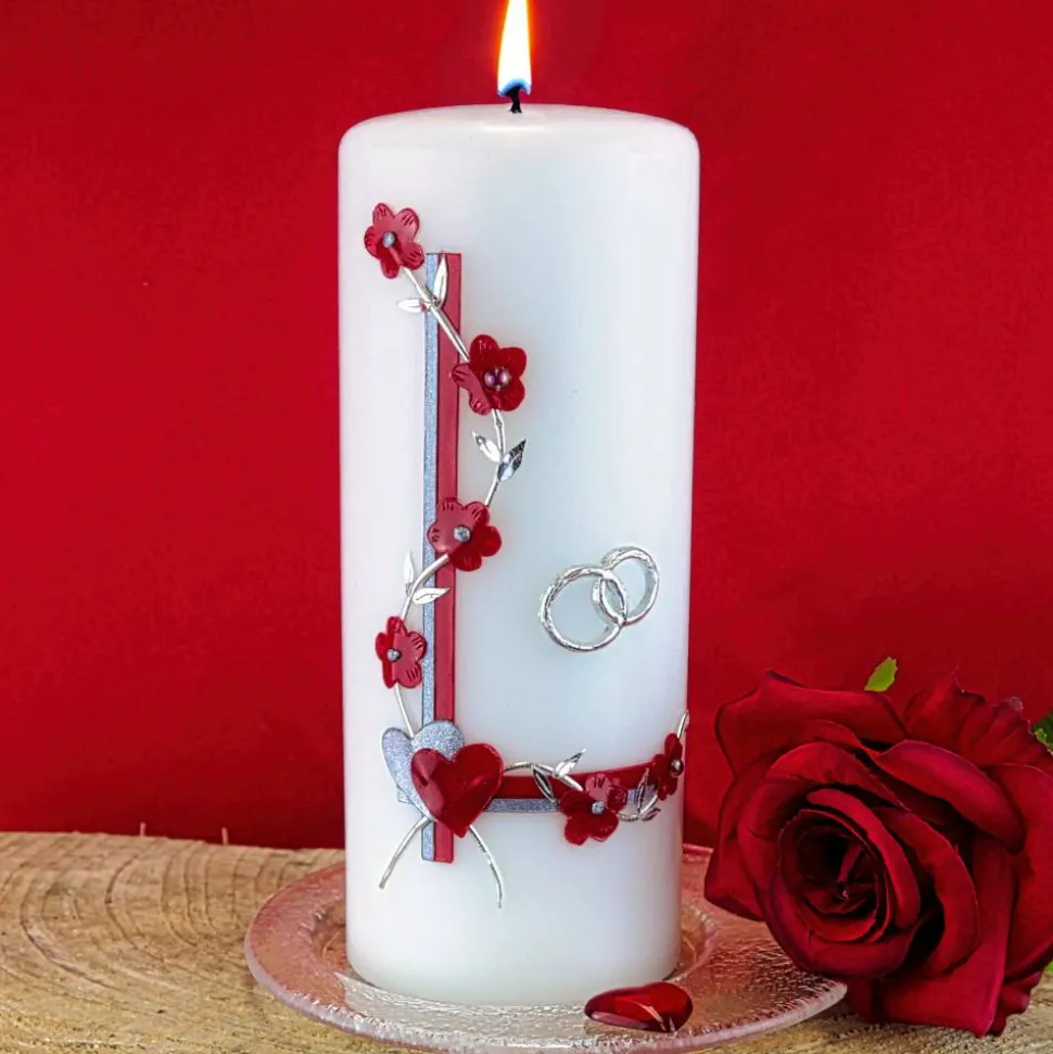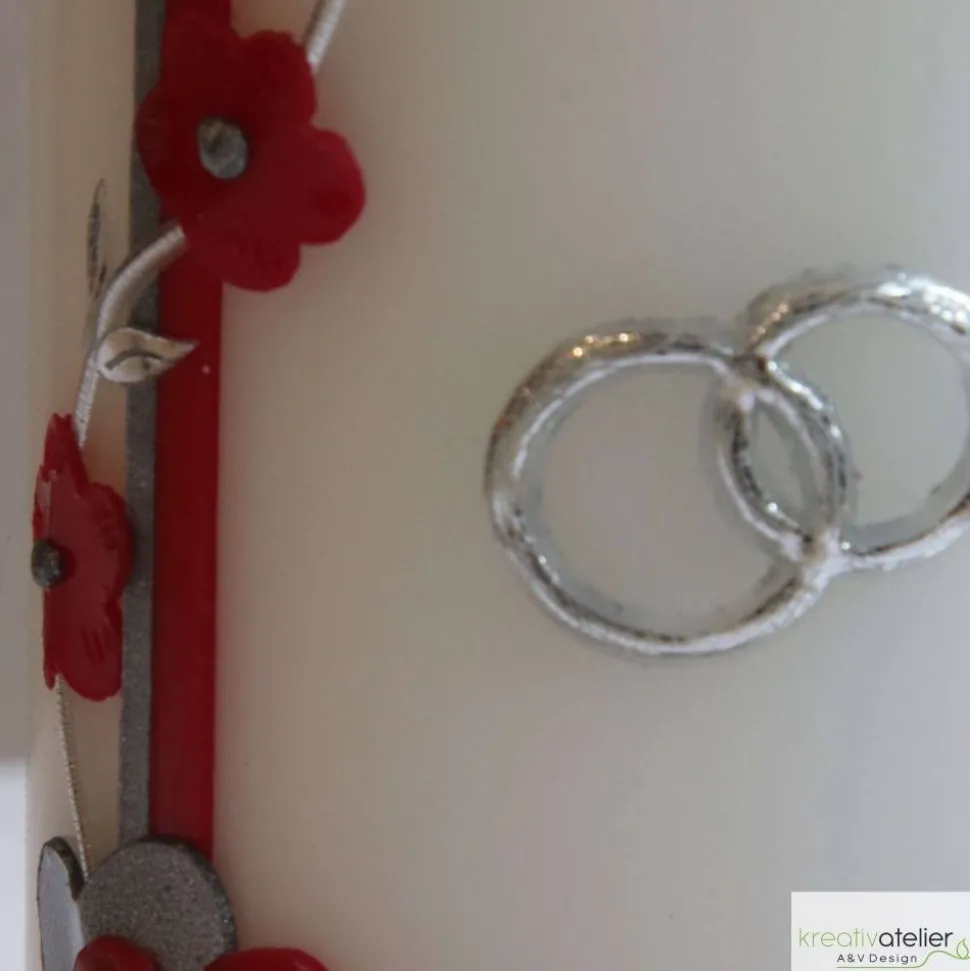 Rubinrot symbolisiert Leidenschaft, Liebe, Romantik, und Feuer. Es ist eine Farbe, die Energie, Kraft und Vitalität ausstrahlt. Auf dieser Hochzeitskerze ist es das Engagement und die Liebe des Brautpaares zueinander. In der christlichen Tradition steht Rubinrot für das Blut Christi, das er für die Menschheit vergossen hat. Das verweist auf die Bedeutung der Heiligkeit der Ehe und die Opferbereitschaft in der Partnerschaft hin.