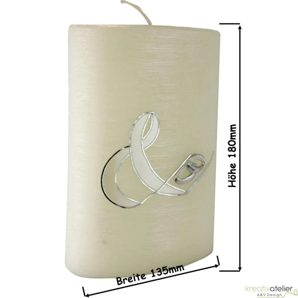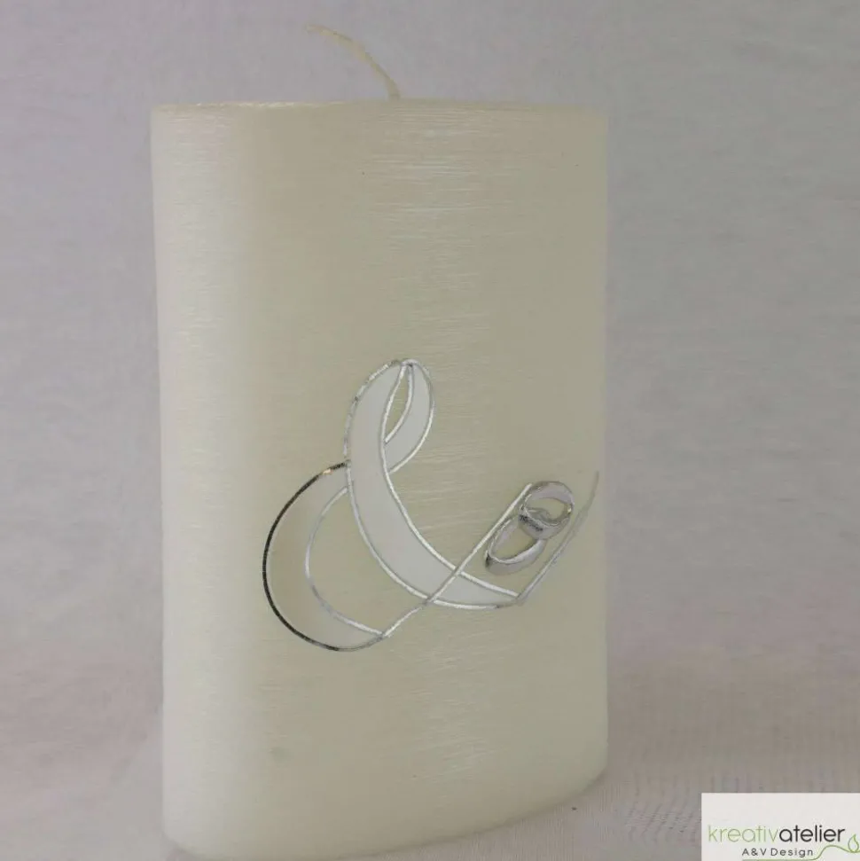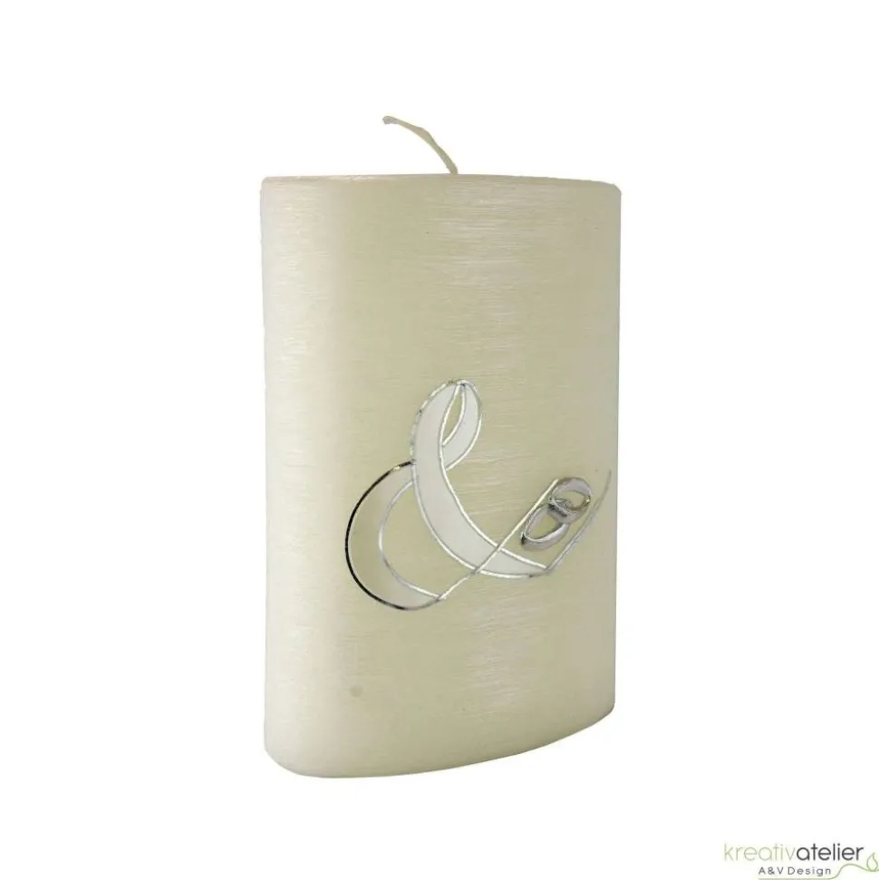 Die Hochzeitskerze hat eine geriffelte Perlmuttoberfläche, die seidig glänzt und eine edle Optik verleiht. Im Mittelpunkt dieser außergewöhnlichen Kerze steht das vollständig aus weißem Wachs hergestellte „&“-Zeichen, das sich Ton-in-Ton der Kerzenoberfläche anpasst. Durch die Einrahmung mit silbernen Wachsstreifen wird das Zeichen hervorgehoben und verleiht der Kerze eine gewisse Eleganz.