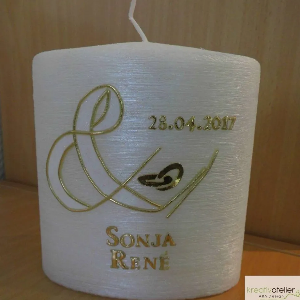 Alle Ornamente und Verzierungen werden einzeln von Hand aus verschiedenen Wachsplatten ausgeschnitten und kunstvoll zu einem harmonischen Bild auf der Kerze arrangiert. Oberhalb der beiden ineinander verschlungenen Ringe ist Platz für die Namen der Brautleute, während das Hochzeitsdatum unterhalb der Ringe platziert wird.