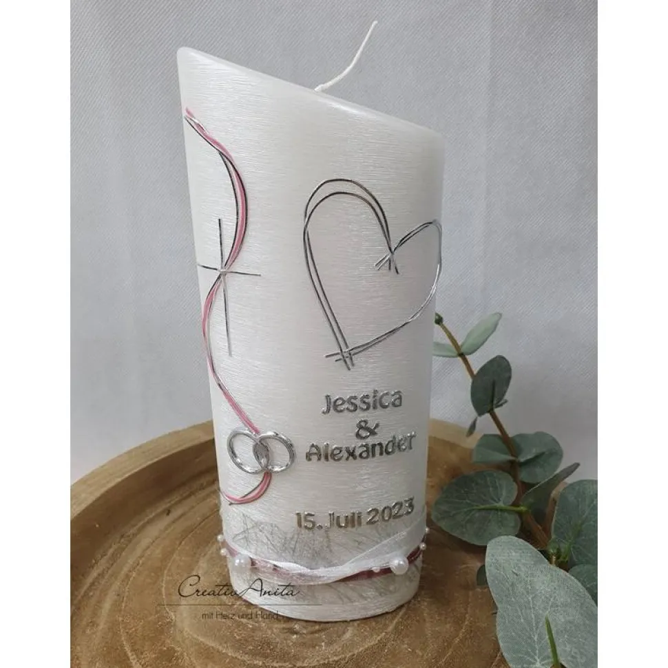 Gerne personalisieren wir die Kerze auch mit zwei Namen und Hochzeitsdatum mit Wachsbuchstaben in silber oder gold.