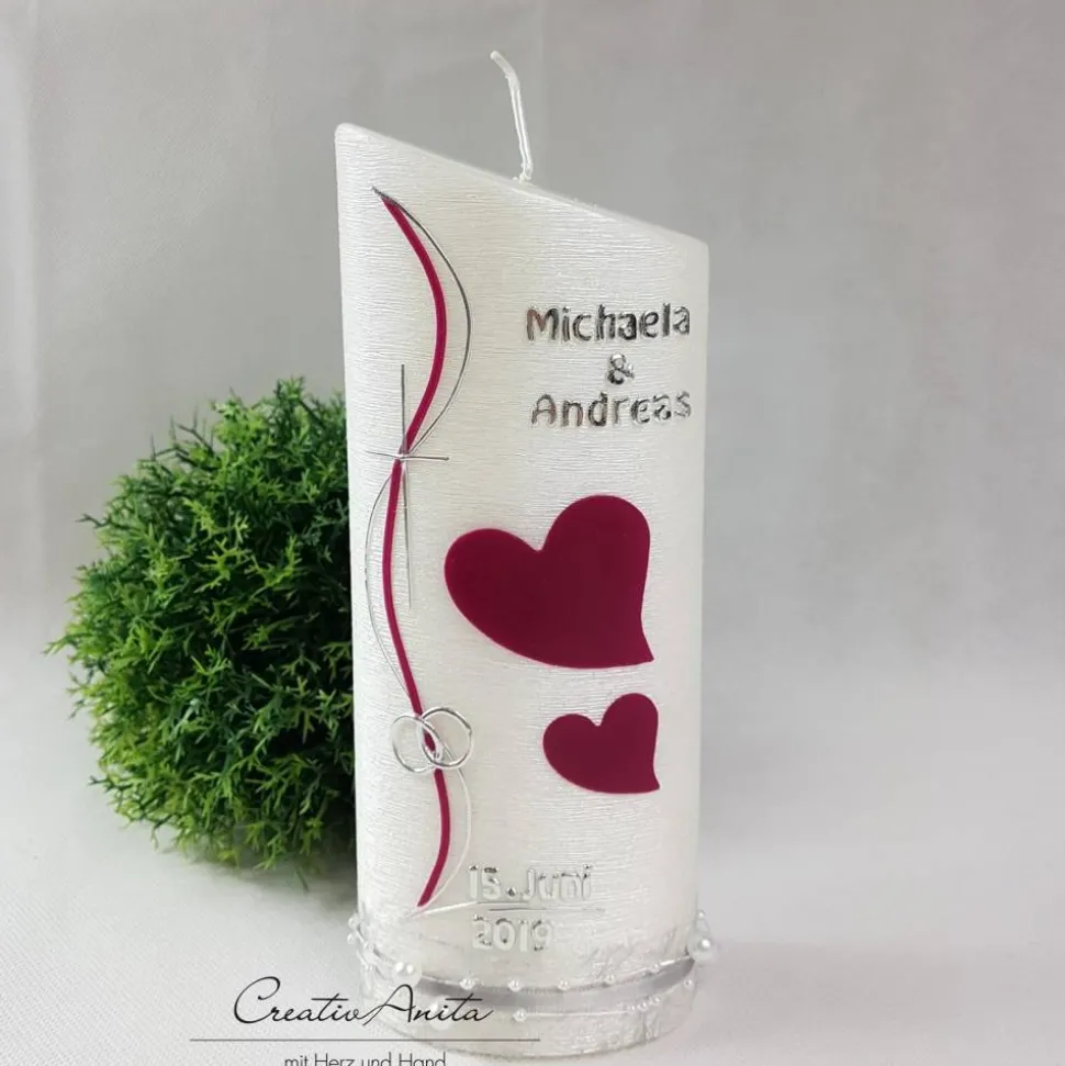 Gerne personalisieren wir die Kerze auch mit zwei Namen und Hochzeitsdatum mit Wachsbuchstaben.