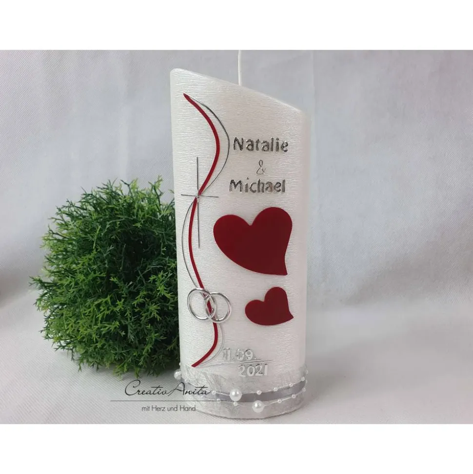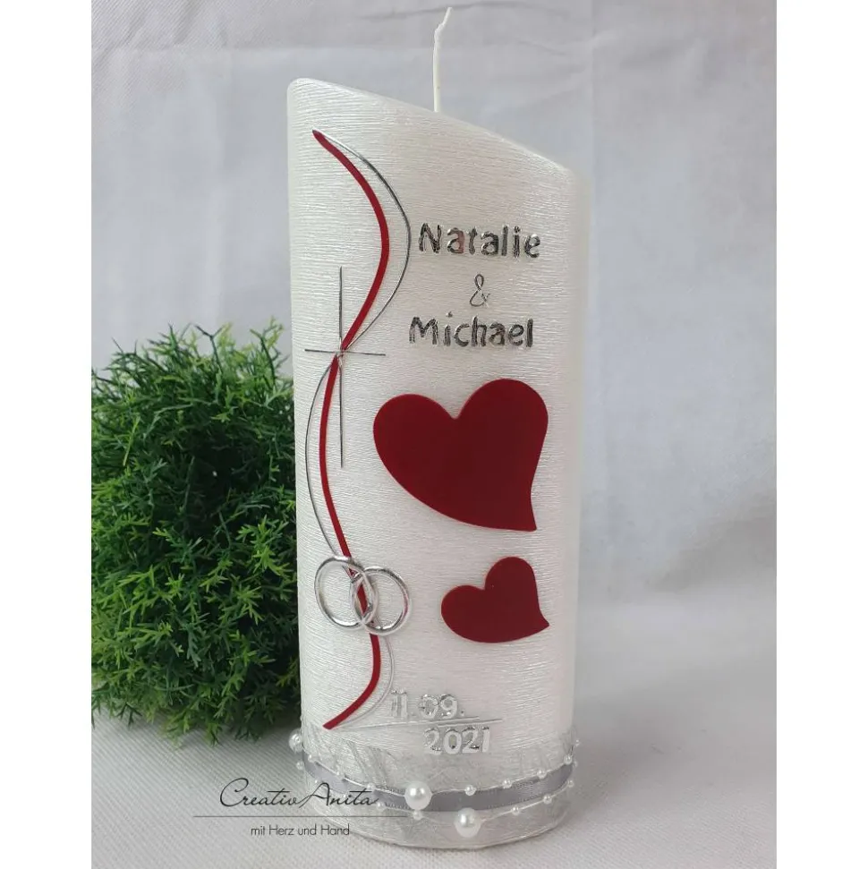 Gerne personalisieren wir die Kerze auch mit zwei Namen und Hochzeitsdatum mit Wachsbuchstaben in silber oder gold.