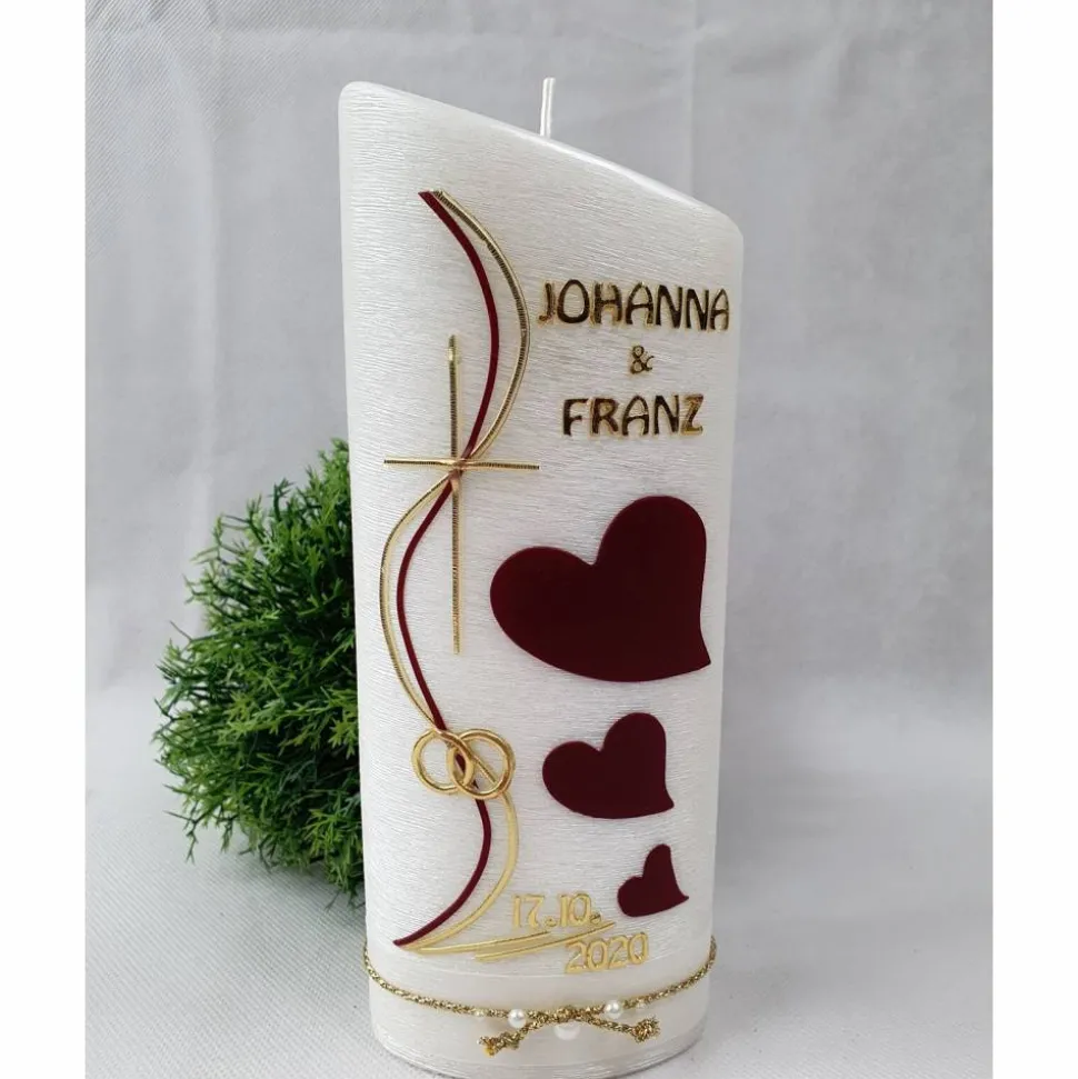 Gerne personalisieren wir die Kerze auch mit zwei Namen und Hochzeitsdatum mit Wachsbuchstaben in gold.