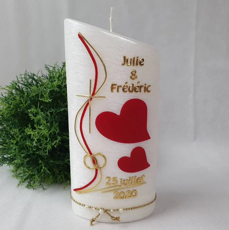 Gerne personalisieren wir die Kerze auch mit zwei Namen und Hochzeitsdatum mit Wachsbuchstaben in silber oder gold.