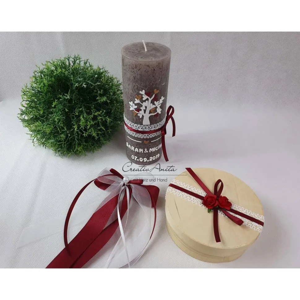 Die Kerze ziert einen Baum mit Herzen, Spitzen- und Satinband.