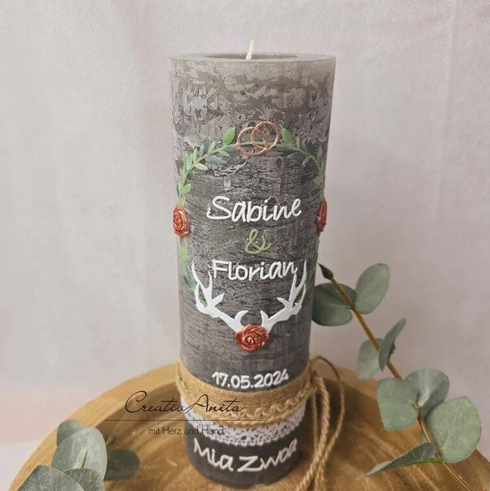 Die Rustikkerze ist grau. Mit Blätterkranz in eukalypthusfarben, Rosen in Roségold. Hirschgeweih und Schriften in weiß.