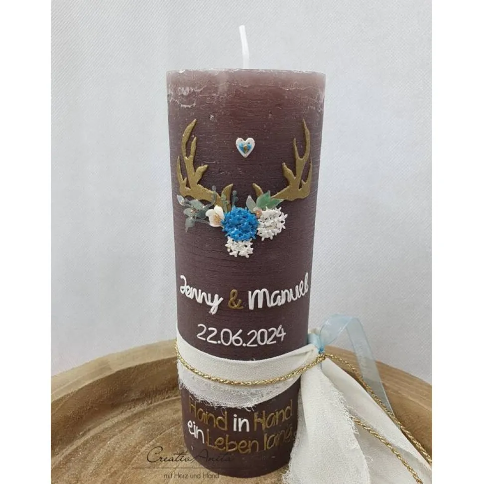 Der Trauspruch auf der Kerze ist inklusive. Wünschen Sie einen anderen oder längeren Spruch, kann es sein, dass weitere Kosten entstehen – bitte vorher anfragen.