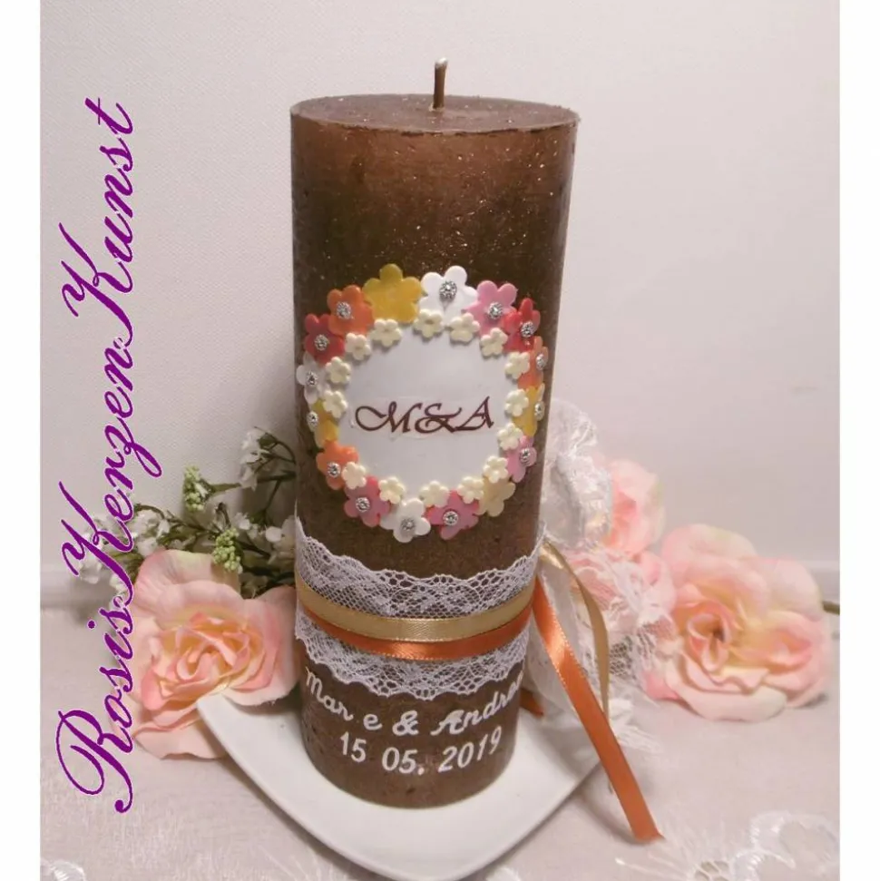 Material : Rustik-Kerze mit RAL-Gütezeichen in braun, Wachsplatten, Verzierwachsstreifen, Perlen, Kerzenschutzlack, Satinband, Spitzenband