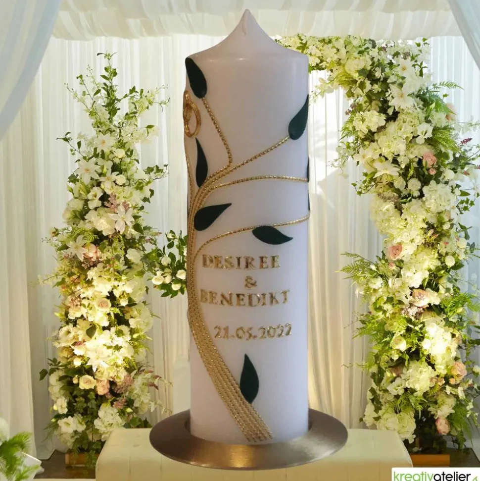 Die Hochzeitskerze kann im unteren rechten Bogen mit den Namen der Brautleute und dem Hochzeitsdatum personalisiert werden. Für die Beschriftung verwende ich ausschließlich Wachs – kein Vinyl, kein Druck, keine Folie. Dadurch entsteht ein reliefartiger 3D-Effekt, der der Kerze eine besonders hohe Wertigkeit verleiht.