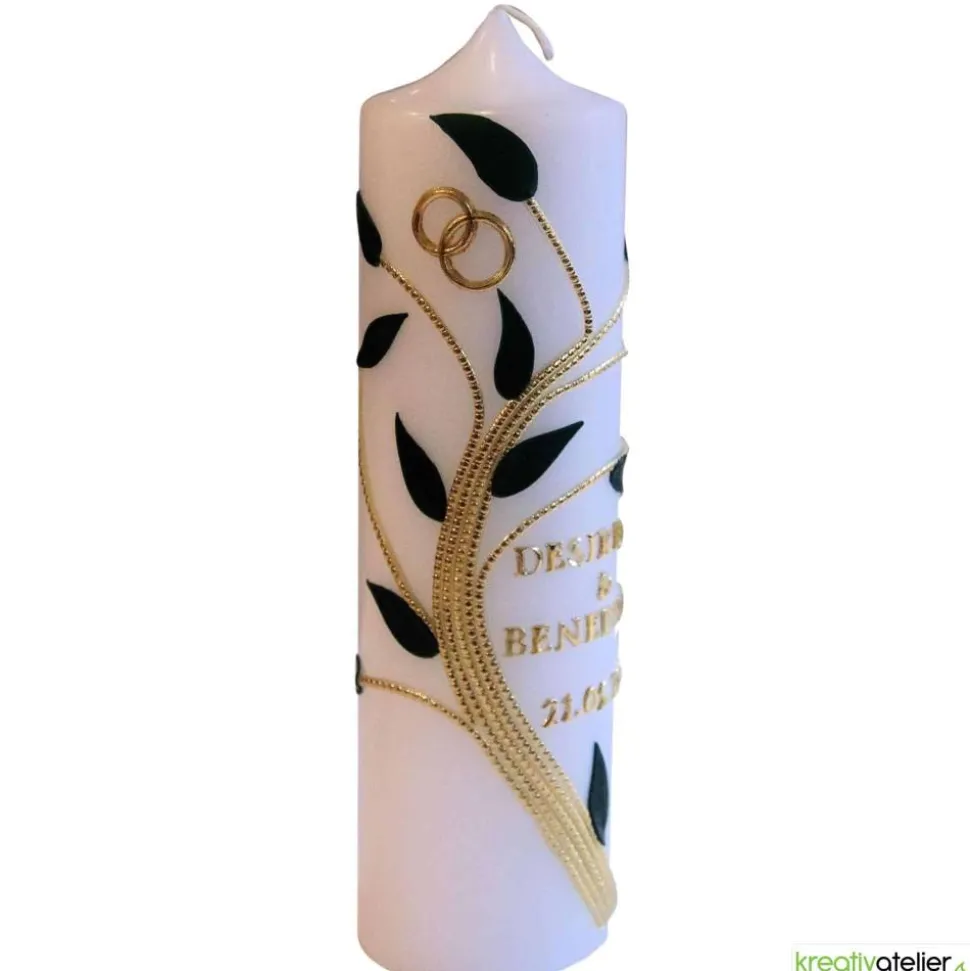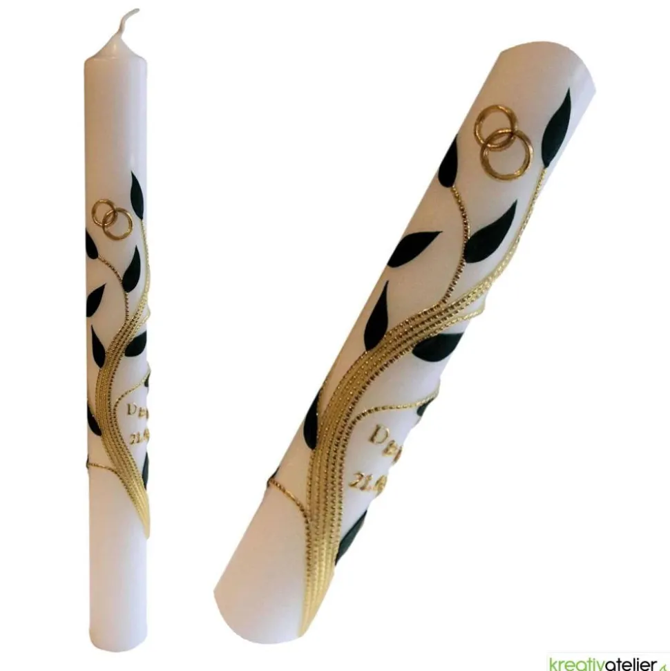 Alle Ornamente, einschließlich der Blattranken und der beiden ineinander verschlungenen Ringe, werden einzeln von Hand aus verschiedenen Wachsplatten ausgeschnitten und kunstvoll zu einem harmonischen Bild auf der Kerze arrangiert. Die grünen Blätter und die goldenen Ranken verleihen der Kerze eine natürliche und zugleich edle Optik.