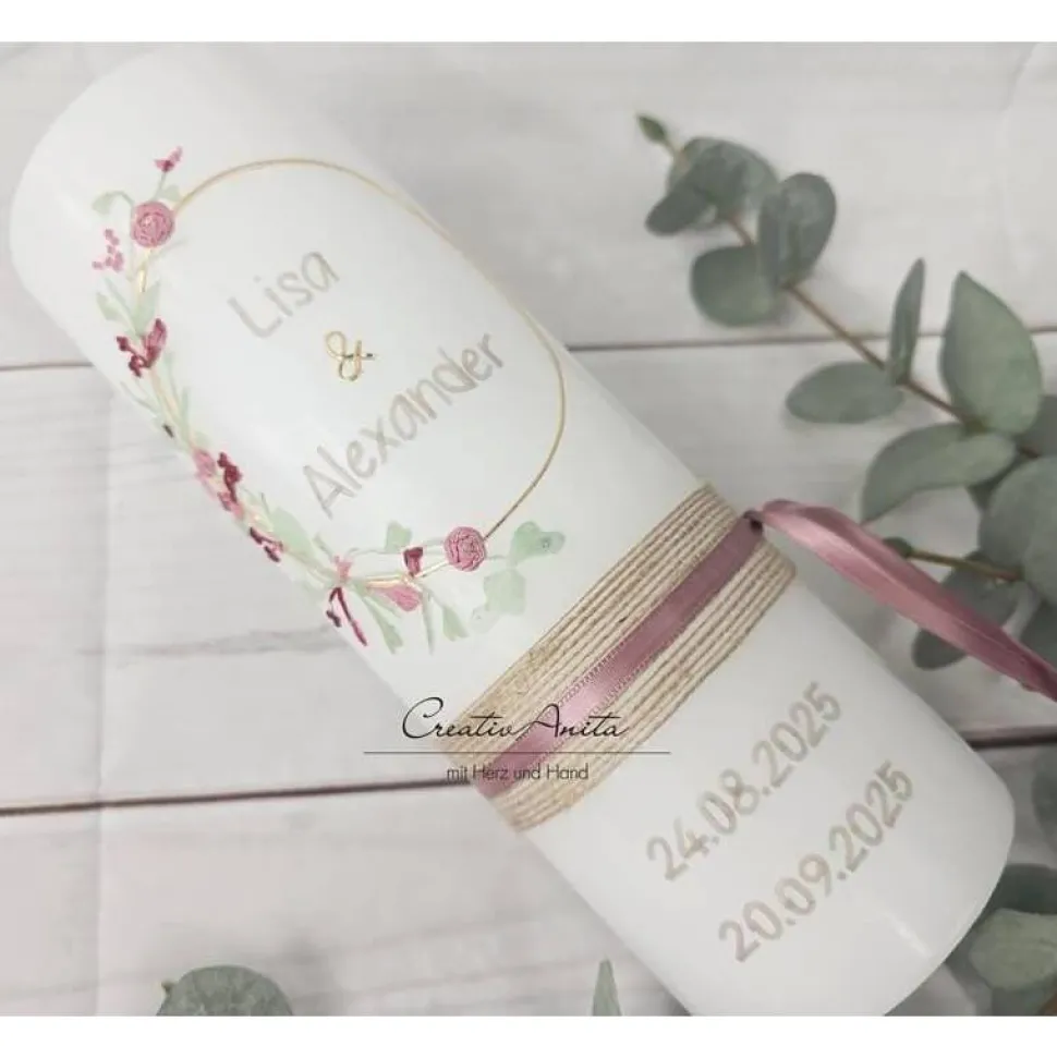 Die Kerze wird durch hochwertige Schleifen-, Spitzen- und Jutebänder aufgewertet.