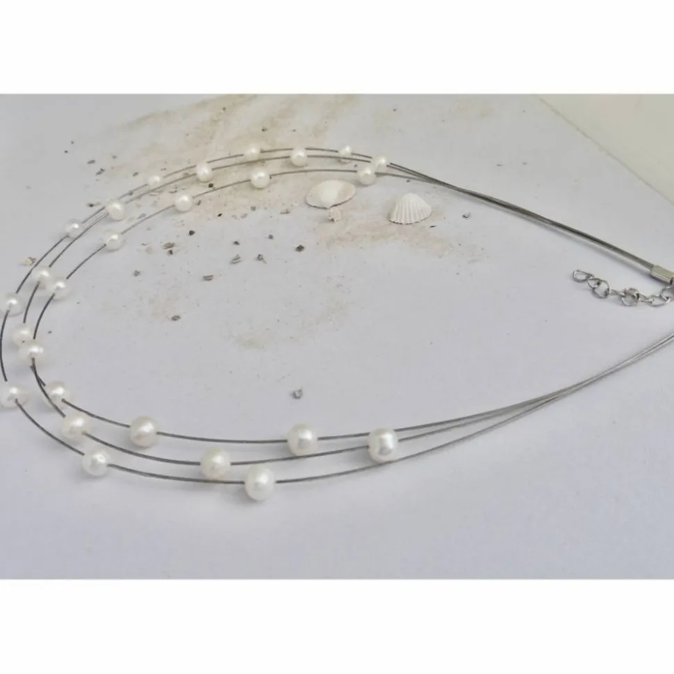 Hier eine Perlenkette aus drei Reihen schwebender gleichmäßig runder echter Süsswasserperlen in 7 mm Größe auf ummanteltem Juwelierdraht.