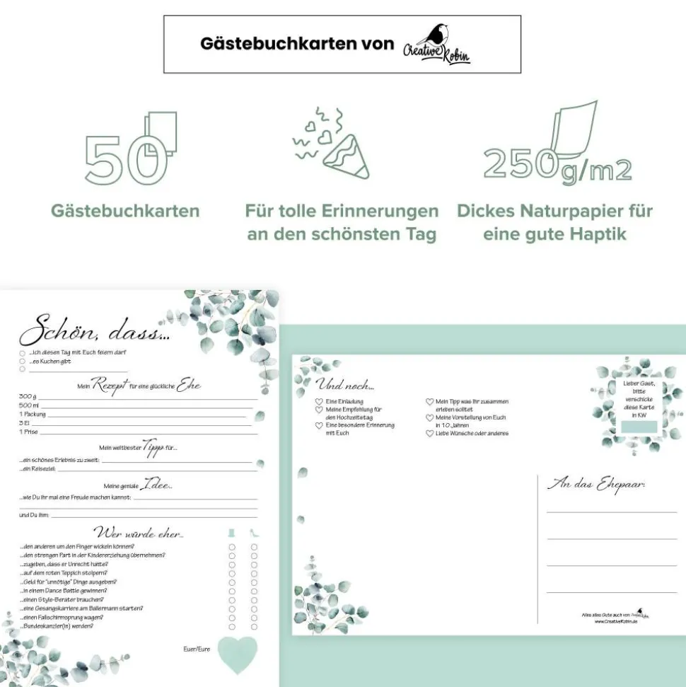 ⭐ KOMPAKT, PRAKTISCH, GUT: Mit einer Größe von 12 x 17 cm passen die Karten überall hin. Und mit 50 Blättern ist das Set perfekt für 50 Gäste.