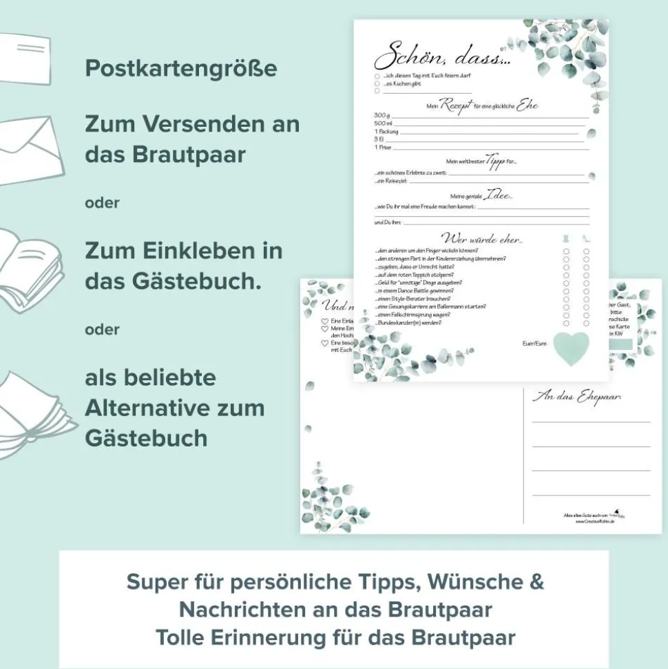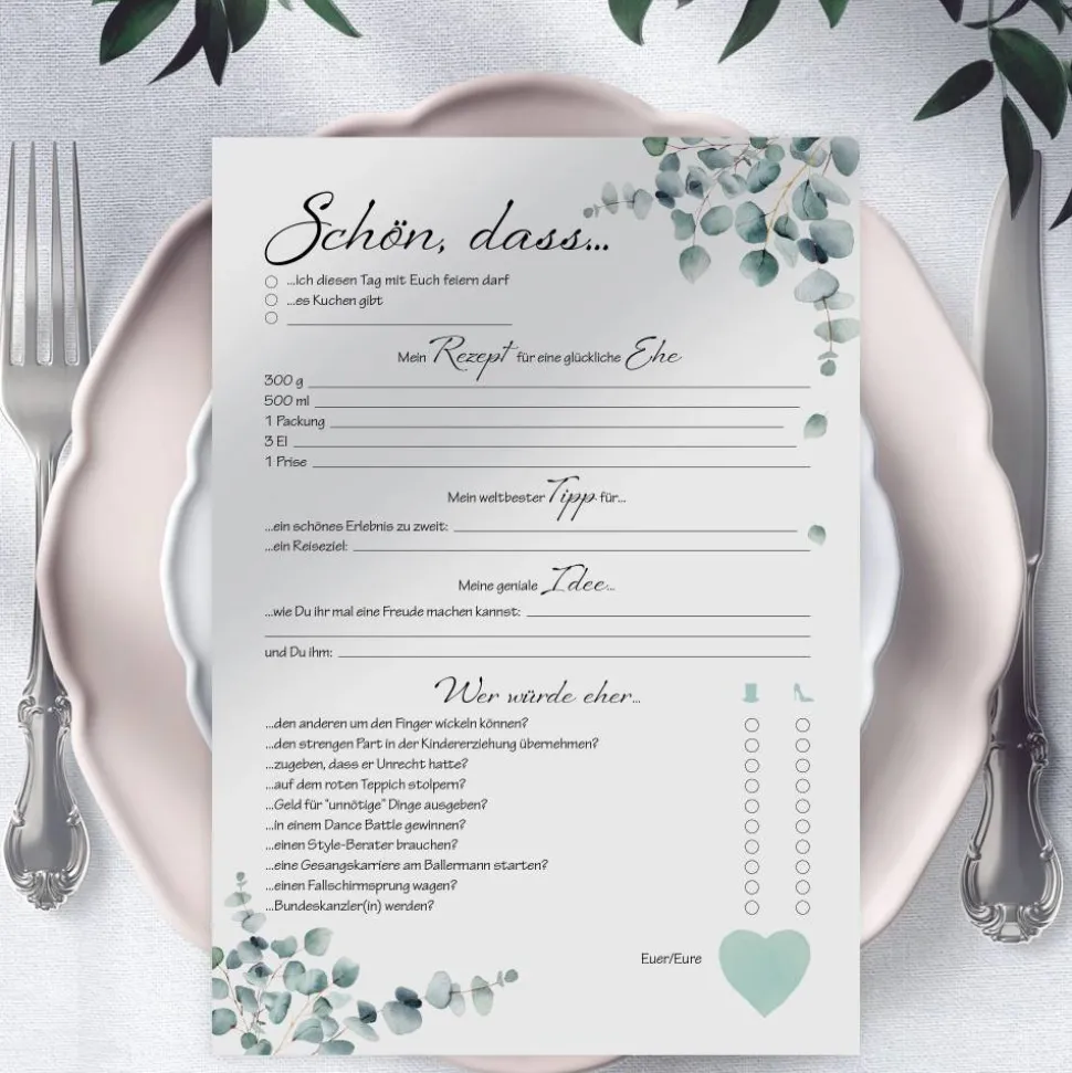 Mit unserem Hochzeitsspiel und Gästebuchkarten erhältst Du nicht nur eine nette Aktivität für Deine Hochzeitsgäste, sondern sammelst auch noch ihre besten Wünsche und Tipps.