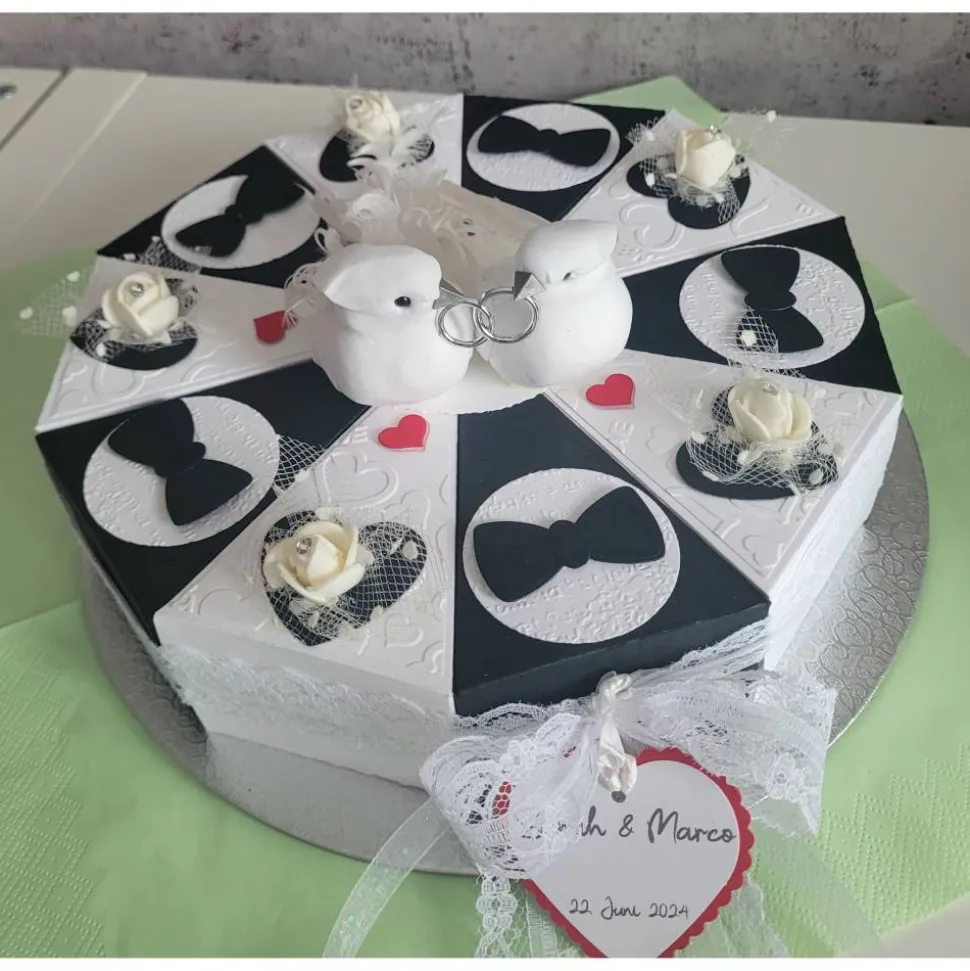 Hochzeitstorte mit 10 Tortenstücken, jedes einzeln befüllbar mit Geld, Gutscheinen, Sprüchen, Fotos, Süßigkeiten usw.