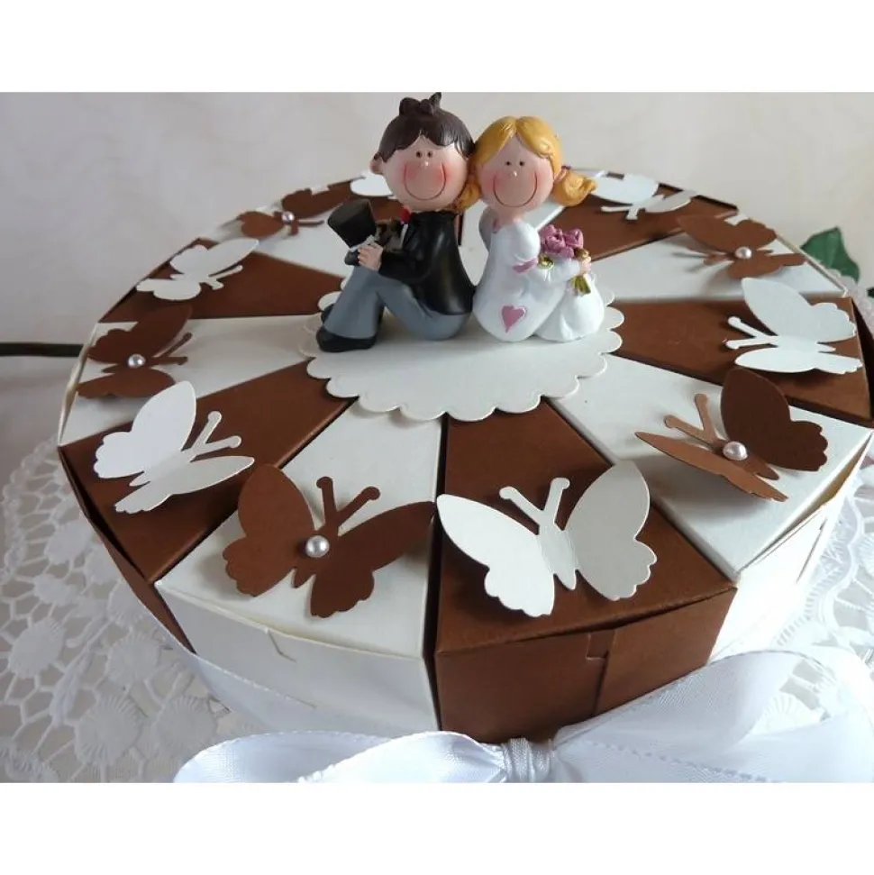 Die 12 Tortenstücke können geöffnet und befüllt werden mit Geld, Gedichten und guten Wünschen und somit hast du eine originelle Geldverpackung. Auch kann die Schachteltorte unter einer Geschenkegemeinschaft aufgeteilt werden und jeder kann ein/einige Stück(e) befüllen.
