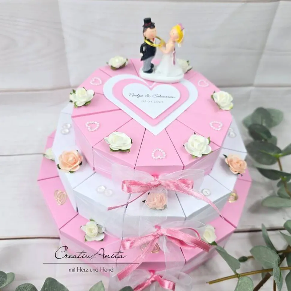 3×12 einzelne Tortenstücke, jedes einzeln nach Belieben befüllbar (z. B. mit Geld, Gutschein, Hochzeitsmandeln, Sprüchen, Süssigkeiten usw.)