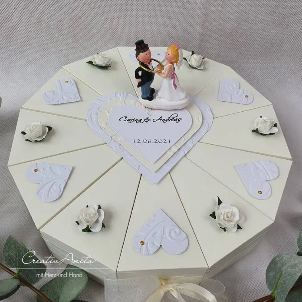 12 einzelne Tortenstücke, jedes einzeln nach Belieben befüllbar (z. B. mit Geld, Gutschein, Hochzeitsmandeln, Sprüchen, Süssigkeiten usw.)