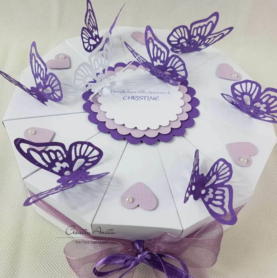 Material: kräftiger Tonkarton, Stanzelemente, Schleifenband, anlassbezogene Deko, beschriftbarer Aufleger