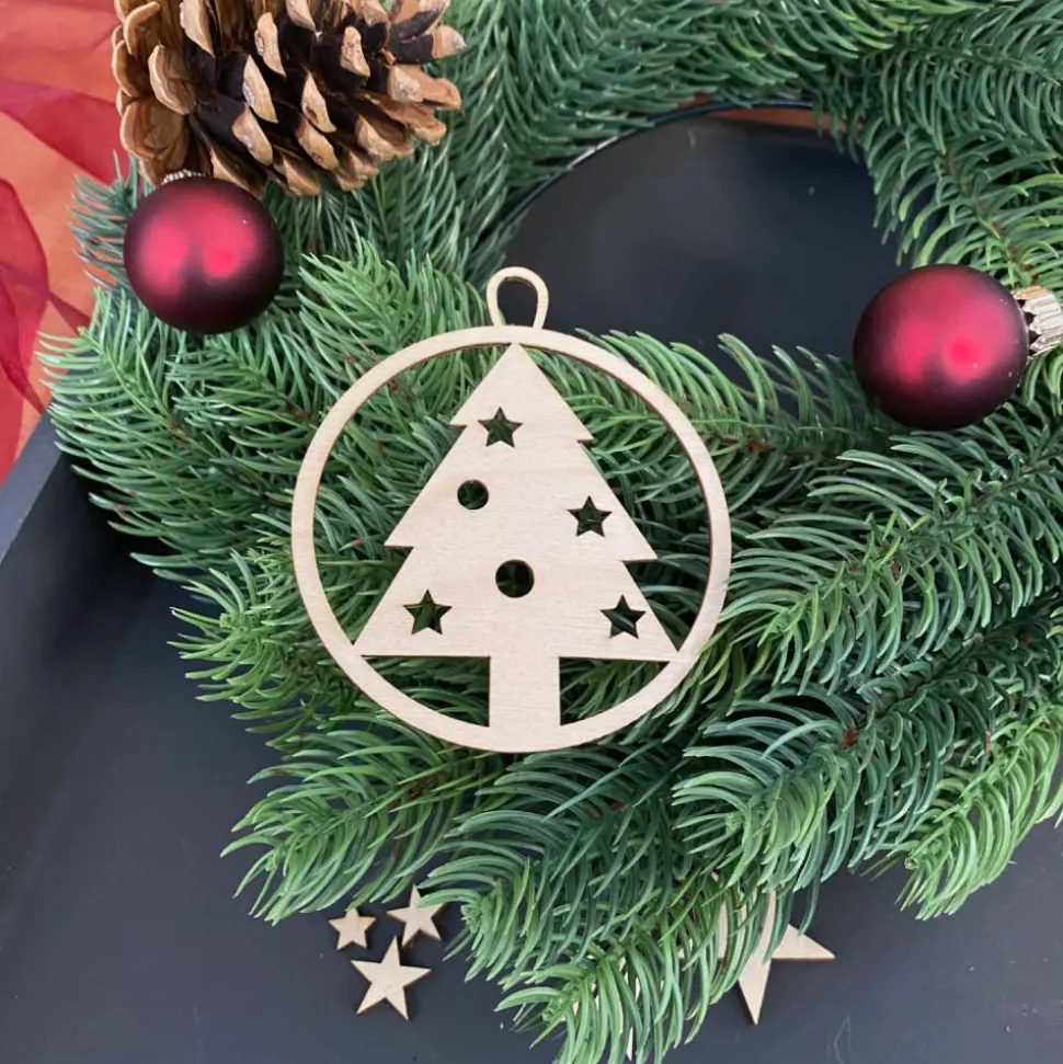 Entdecke den einzigartigen Geschenkanhänger aus Holz in Christbaumkugelform! Mit detailreichen Ausschnitten von Weihnachtsbaum, Kugeln und Sternen ist dieser Anhänger ein besonderer Blickfang für deine Weihnachtsgeschenke oder als Christbaumanhänger.