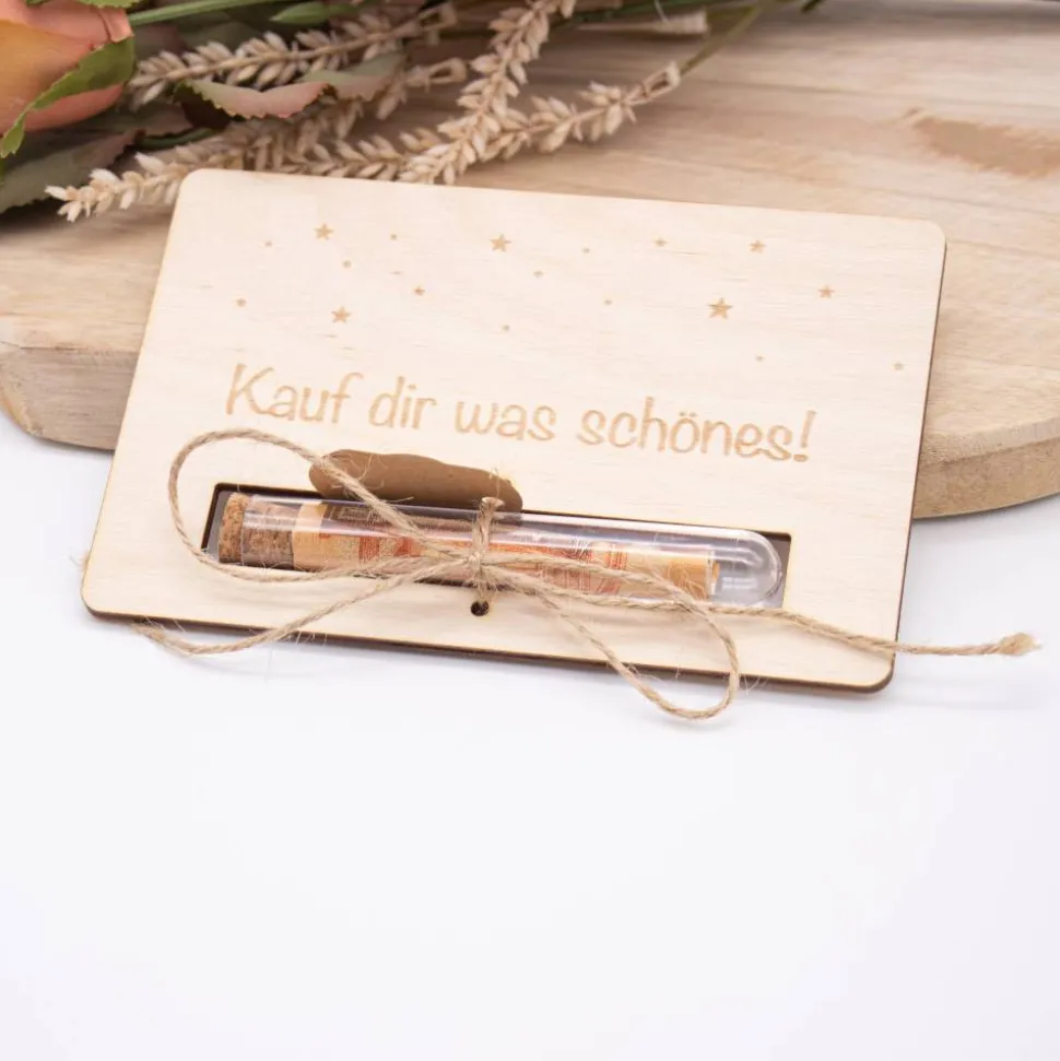 Unsere Lasergravurtechnologie ermöglicht es, kreative Designs, maßgeschneiderte Botschaften und persönliche Details auf das Holz zu übertragen. Dadurch wird jedes Geldgeschenk zu einem einzigartigen Unikat, das von Herzen kommt. Die Präzision der Gravur sorgt dafür, dass jedes Detail gestochen scharf und beeindruckend dargestellt wird.