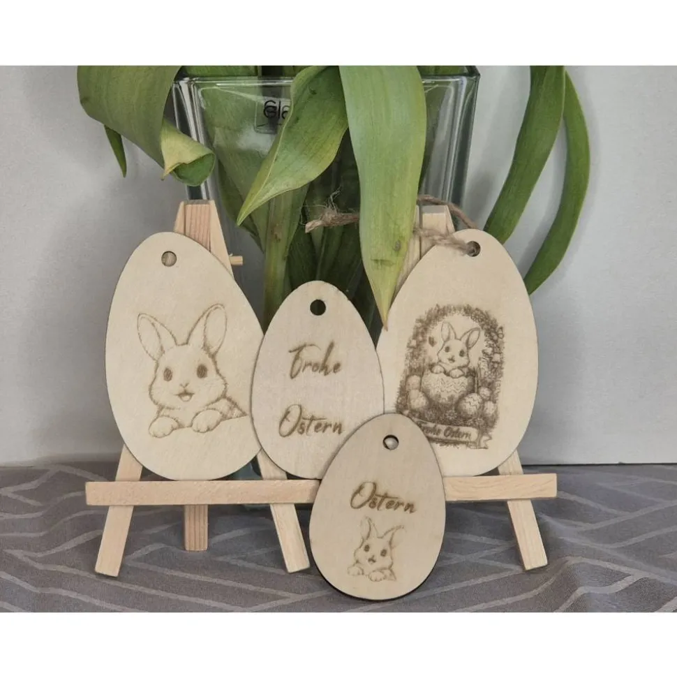 Dieses dekorative Set besteht aus vier hochwertigen Holzeiern, gefertigt aus 3mm starkem Birkenholz. Die Ostereier wurden mit einem Lasergravierer exakt geschnitten und sind beidseitig mit wunderschönen Oster-Motiven graviert, was sie zum absoluten Blickfang an deinem Osterstrauch oder als kreative Deko macht.