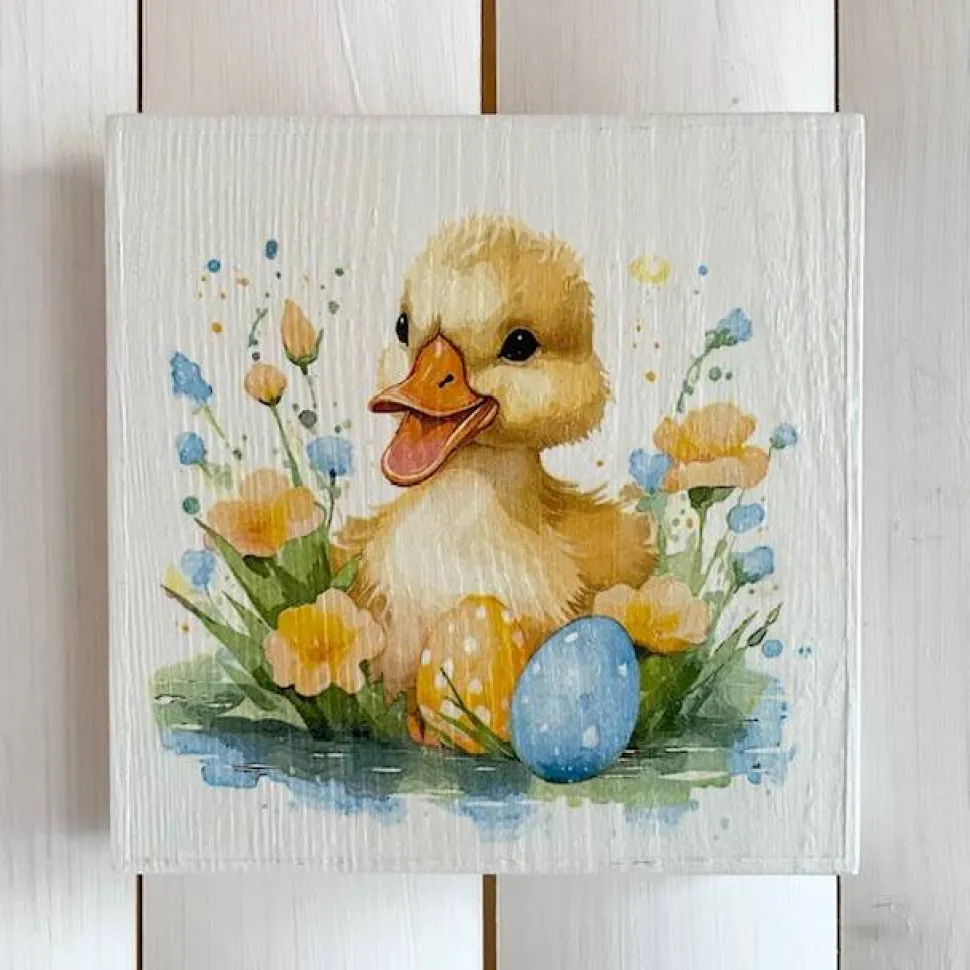 Holzbild, kleine Ente mit Ostereiern, Serviettentechnik auf Holzbrett. Süße Osterdeko.