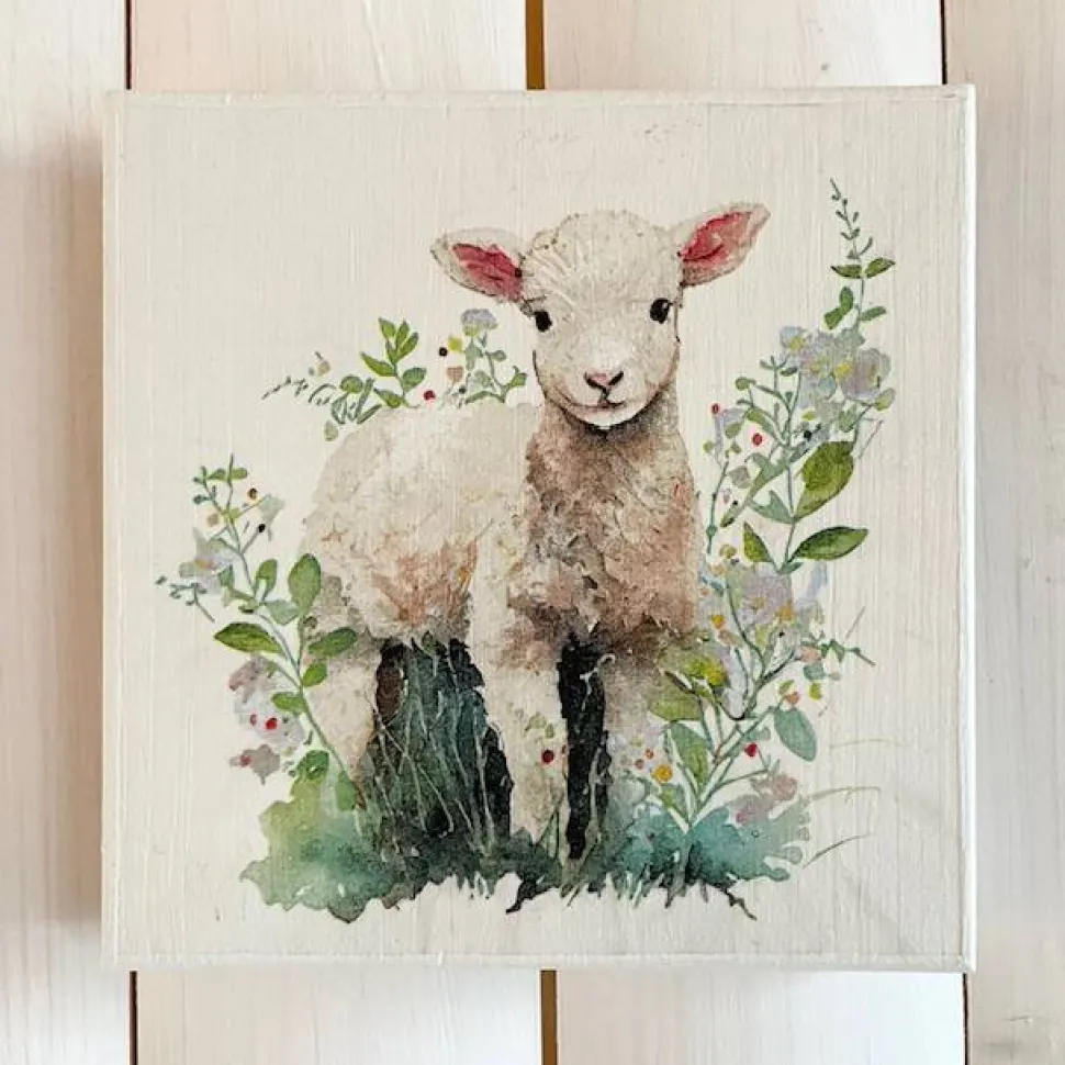 Holzbild, Osterlamm, Serviettentechnik auf Holzbrett. Süße Osterdeko.