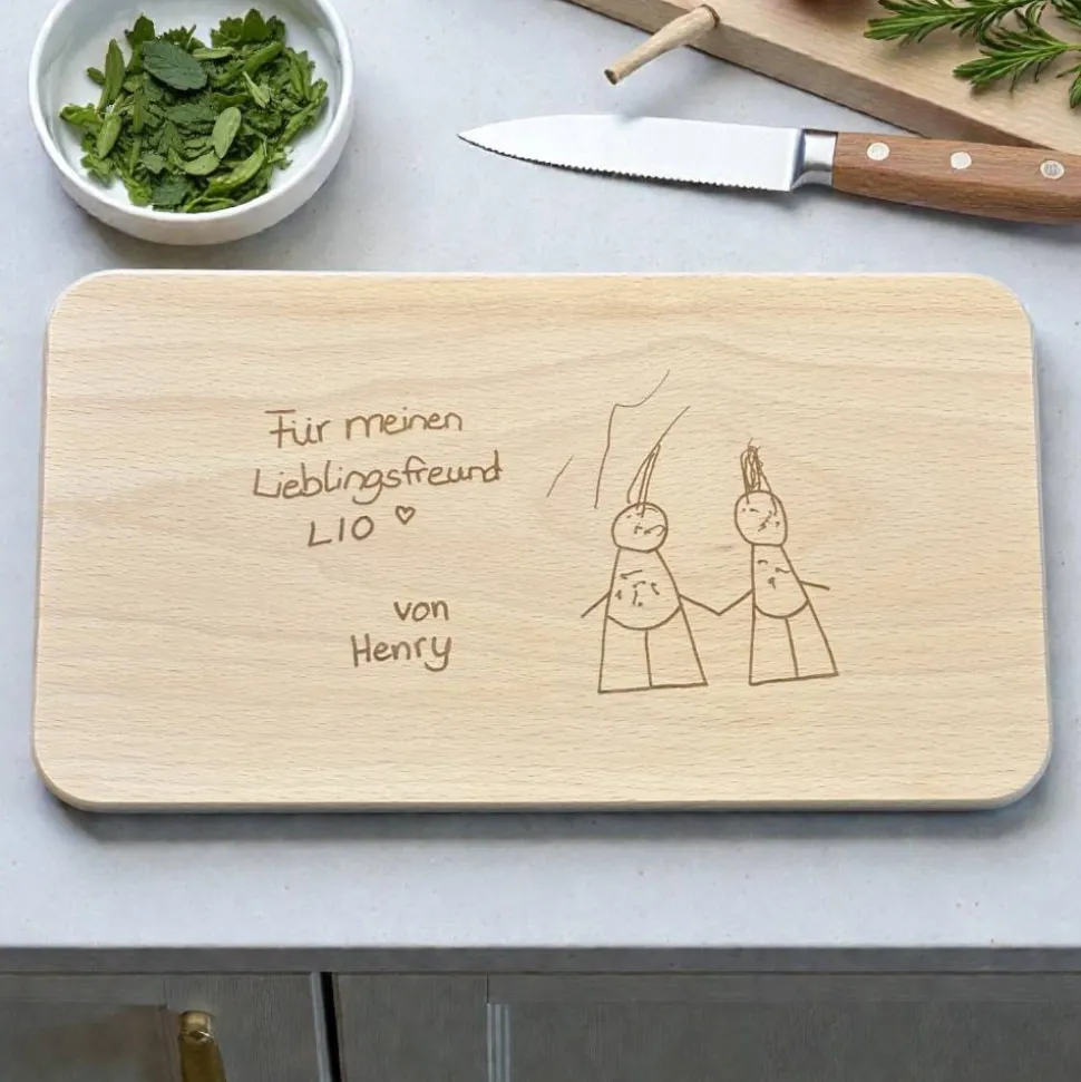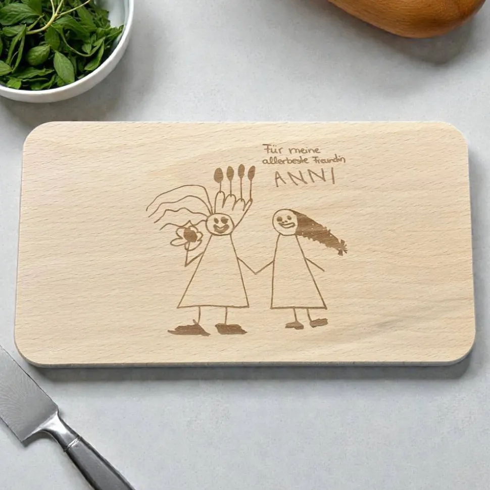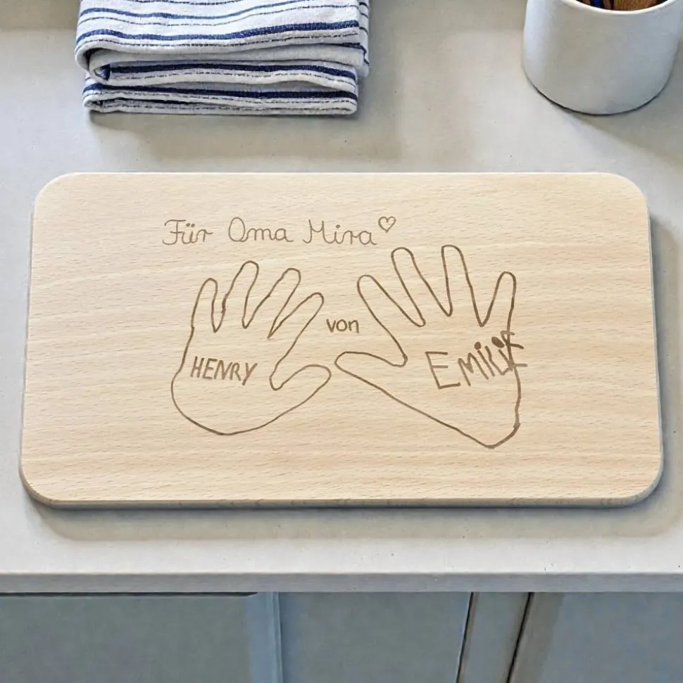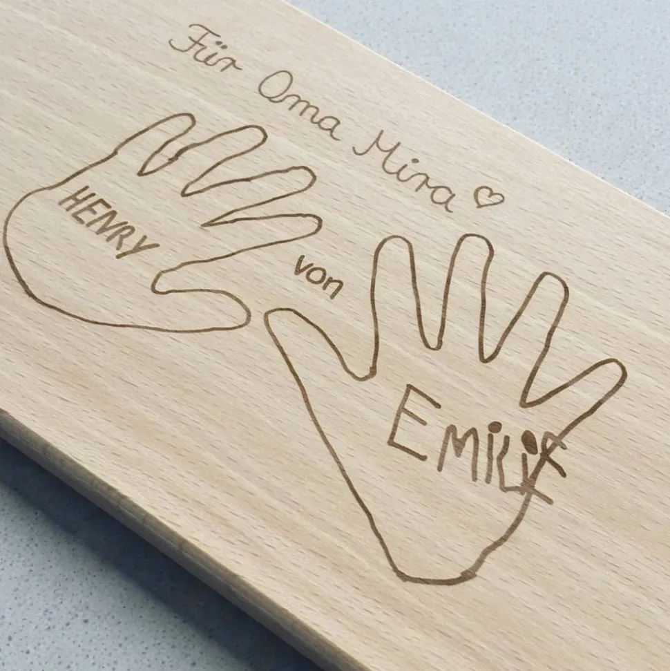 Die Gravur wird individuell nach den Wünschen der Kundinnen und Kunden angefertigt. Standardmäßig befindet sich unten rechts ein dezent gelaserter Schriftzug.