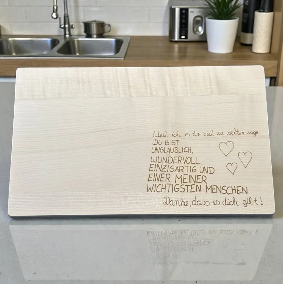 Das große Holzbrettchen besteht aus hochwertigem Ahornholz und eignet sich ideal als klassisches Schneidebrett.