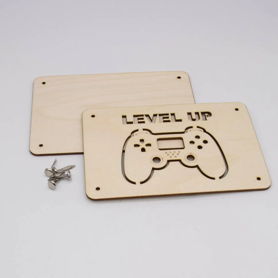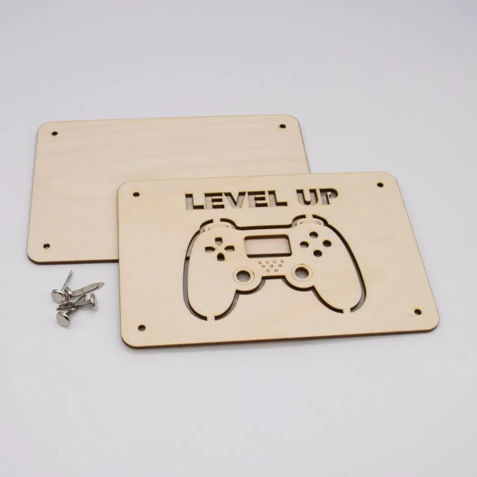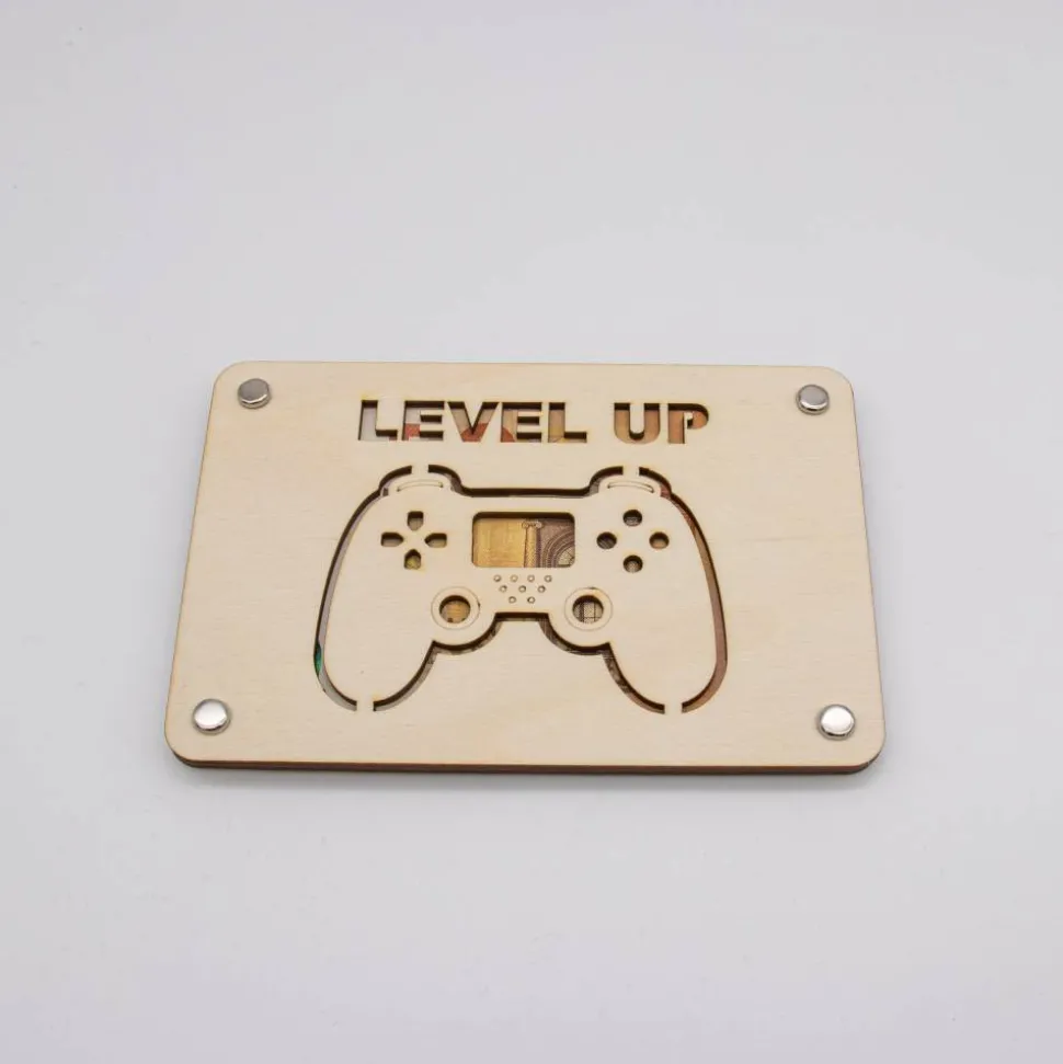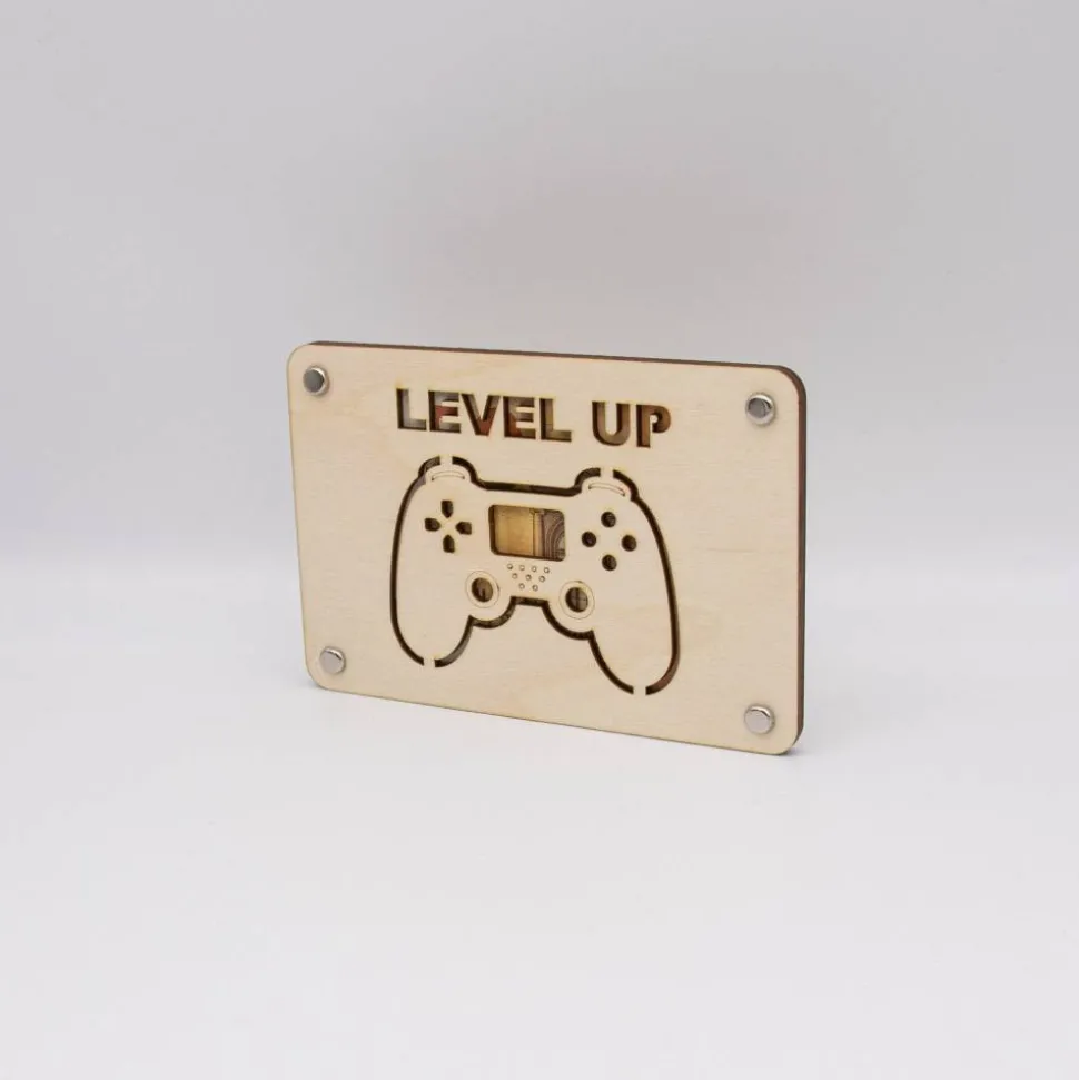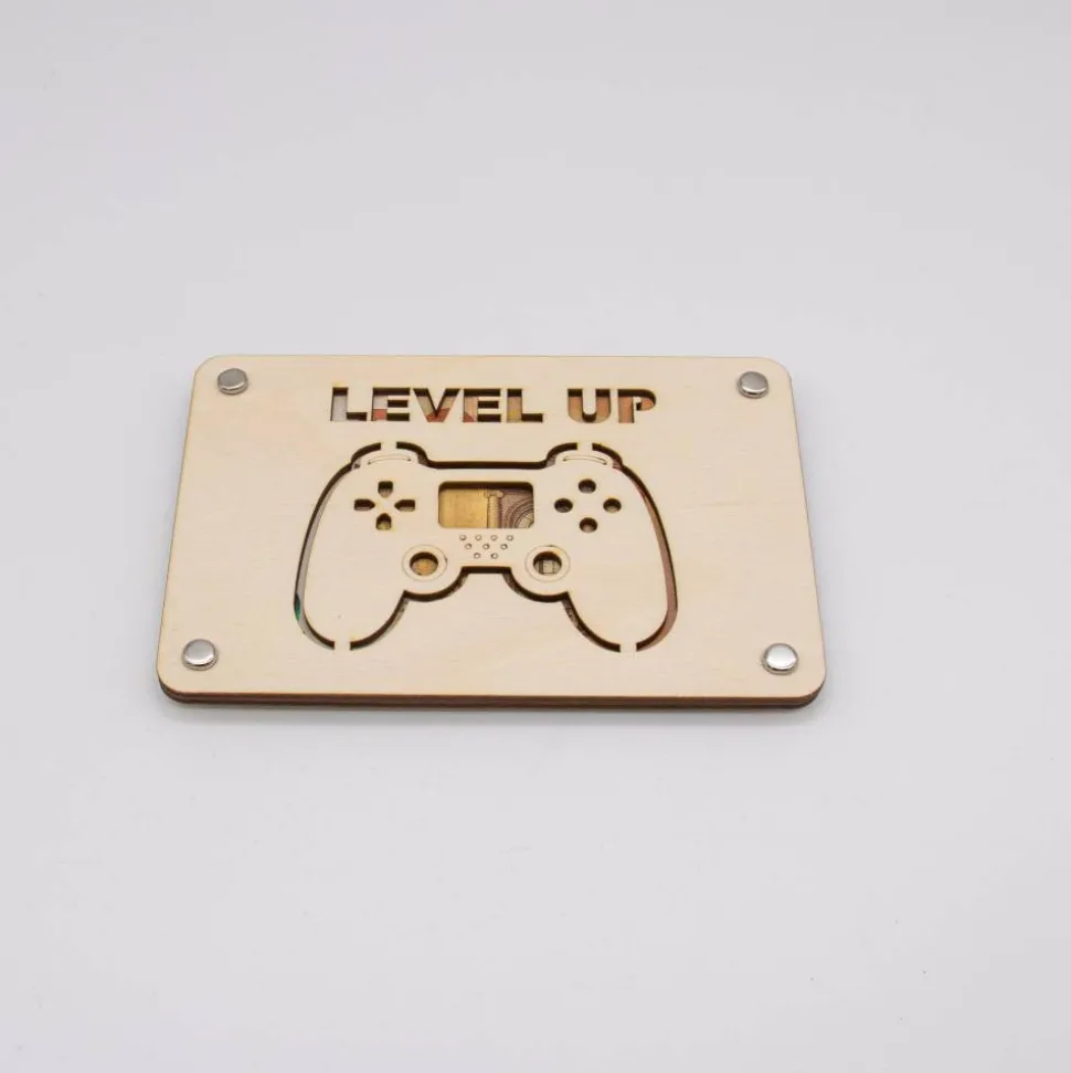 Das Herzstück dieser Karte ist ein akribisch ausgelaserter Controller, der kunstvoll in das Holz geschnitten ist. Das Motiv wird von dem inspirierenden Schriftzug „Level Up“ begleitet, was nicht nur für eine Aufwertung im Spiel, sondern auch im Leben steht. Die sorgfältig lasergeschnittenen Details bieten einen spannenden Blick auf das darunterliegende Geldgeschenk und betonen die Exklusivität dieses Geschenks.