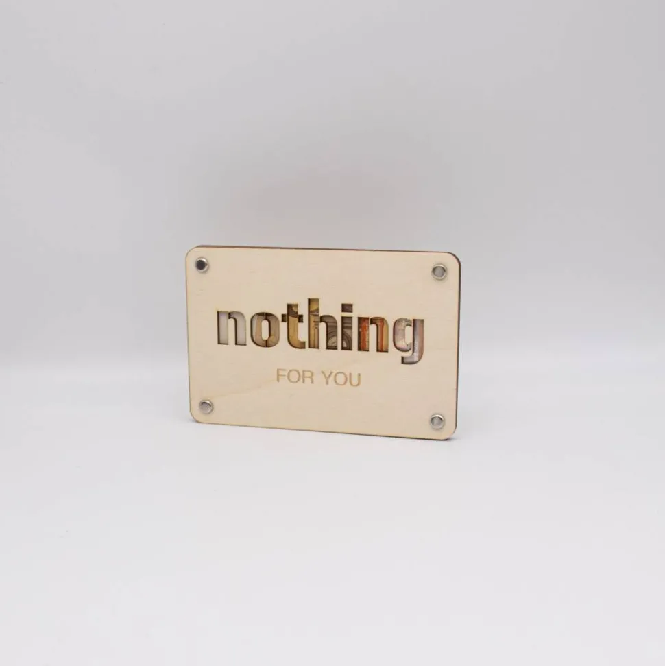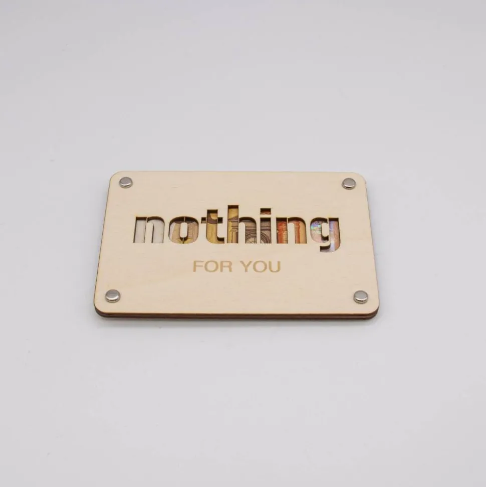 Das Herzstück dieses Produktes ist der ausgelaserte Schriftzug „nothing“ auf der Vorderseite, der den Satz „nothing for you“ symbolisiert. Dieser Schriftzug ist sorgfältig mit einem Laser ausgeschnitten, um präzise und klare Konturen zu schaffen, die einen raffinierten Blick auf das eingelegte Geld ermöglichen. Die Karte besteht aus zwei Platten, die jeweils mit mehreren Löchern versehen sind. Diese Löcher dienen dazu, Klammern durchzustecken, mit denen die Platten zusammengehalten und das Geld sicher zwischen ihnen fixiert wird.