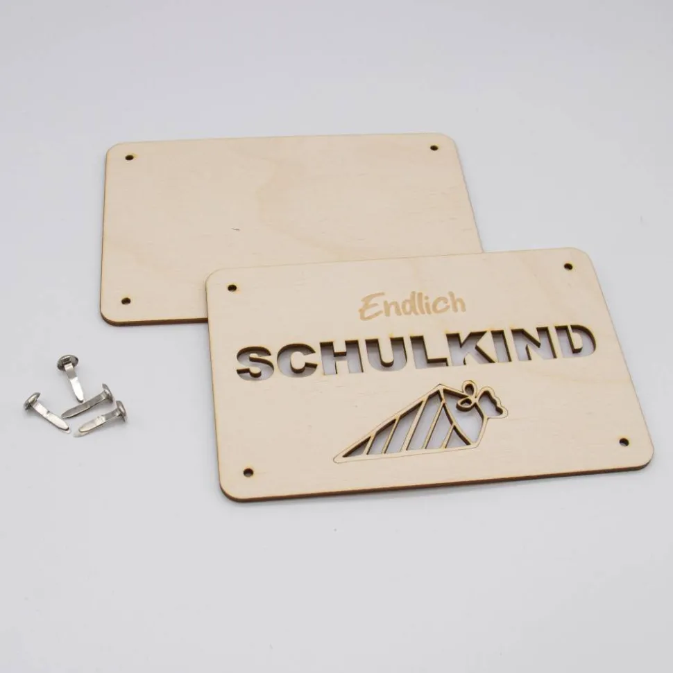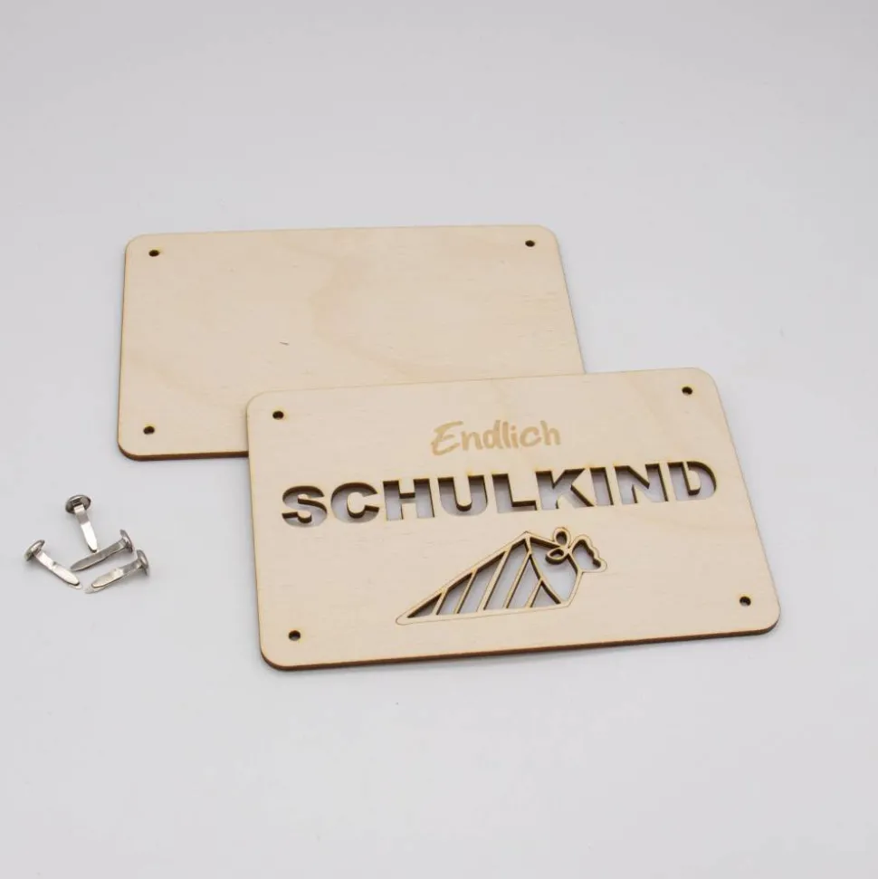 Funktionsweise: Die Karte besteht aus zwei sorgfältig zugeschnittenen Holzplatten, die jeweils 3mm dick sind. Die Platten sind mit präzisen Löchern versehen, durch die kleine Klammern gesteckt werden können, um die Platten zusammenzuhalten. Zwischen diesen beiden Holzplatten wird das Geld platziert. Durch die kunstvoll ausgelaserten Stellen des „SCHULKIND“-Motivs ist das Geld sichtbar und wird so Teil des Gesamtdesigns.