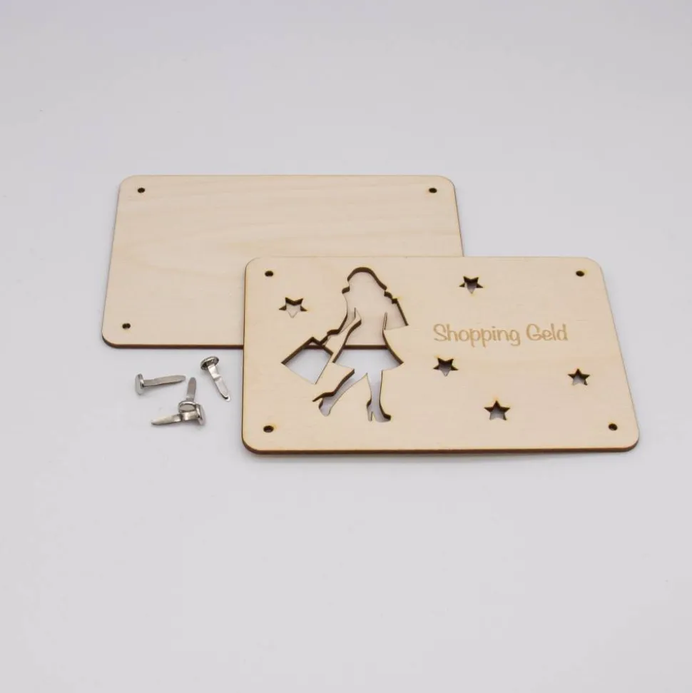 Funktionsweise: Die Karte besteht aus zwei sorgfältig zugeschnittenen Holzplatten, die jeweils 3mm dick sind. Die Platten sind mit präzisen Löchern versehen, durch die kleine Klammern gesteckt werden können, um die Platten zusammenzuhalten. Zwischen diesen beiden Holzplatten wird das Geld platziert. Durch die kunstvoll ausgelaserten Stellen des „Shopping Girl“-Motivs ist das Geld sichtbar und wird so Teil des Gesamtdesigns.